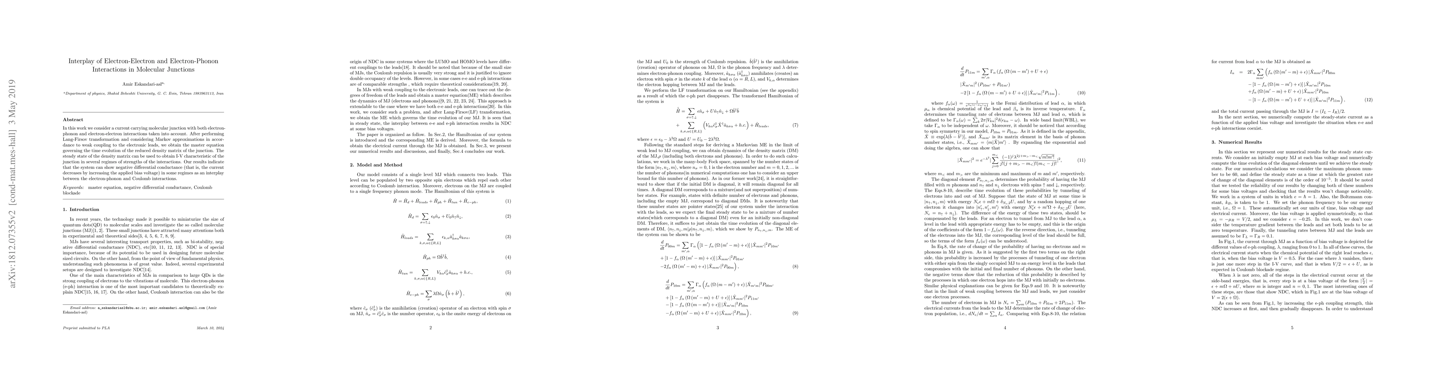 This paper investigates a current-carrying molecular junction considering both electron-phonon and electron-electron interactions. Through a Lang-Firsov transformation and Markov approximations, it derives a master equation for the time evolution of the junction’s density matrix, revealing potential negative differential conductance due to the interplay of these interactions.