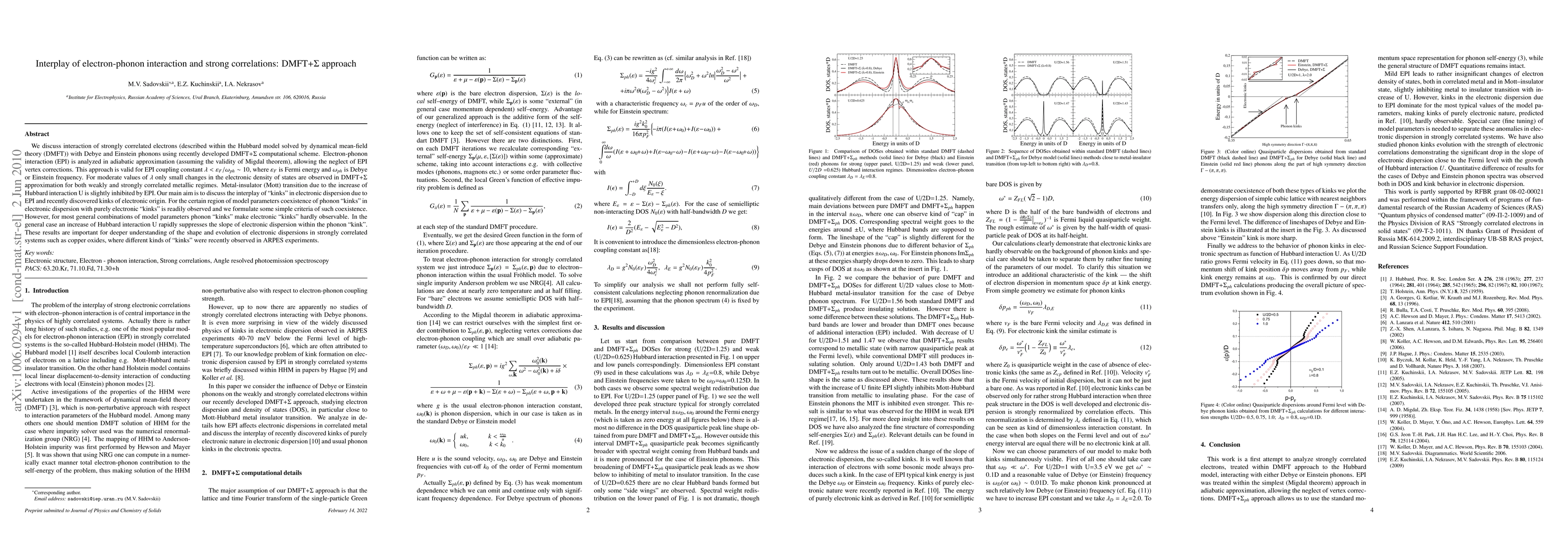This paper examines the interaction between strongly correlated electrons and phonons using the DMFT+Sigma approach, finding minimal changes in electronic density of states for moderate electron-phonon coupling. It reveals that electron-phonon interaction slightly inhibits metal-insulator transitions and discusses the coexistence of phonon-induced and electronic "kinks" in electronic dispersion, relevant for understanding electronic behaviors in strongly correlated materials like copper oxides.
