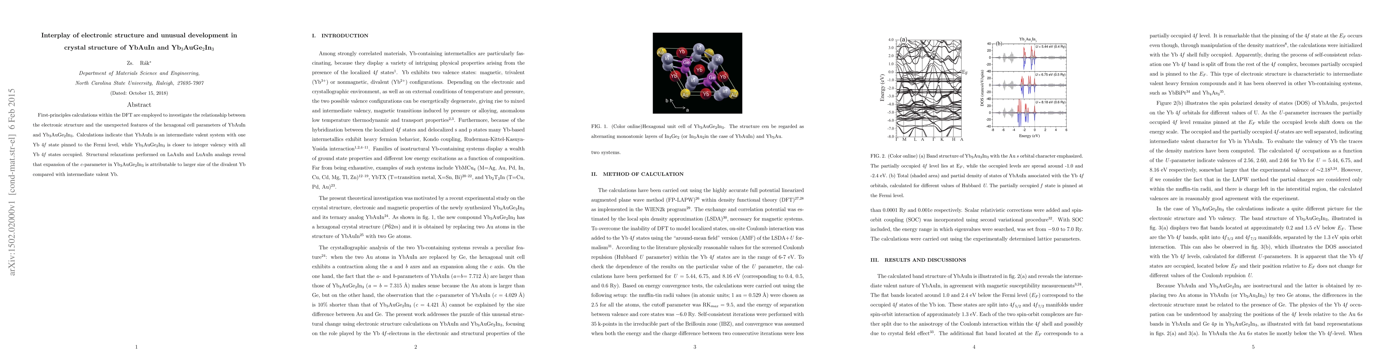First-principles DFT calculations reveal YbAuIn as an intermediate valent system with a Yb 4f state at the Fermi level, while Yb3AuGe2In3 approaches integer valency with fully occupied Yb 4f states. Structural analysis suggests the unusual c-parameter expansion in Yb3AuGe2In3 is due to the larger size of divalent Yb compared to intermediate valent Yb, as confirmed by LaAuIn and LuAuIn analog studies.