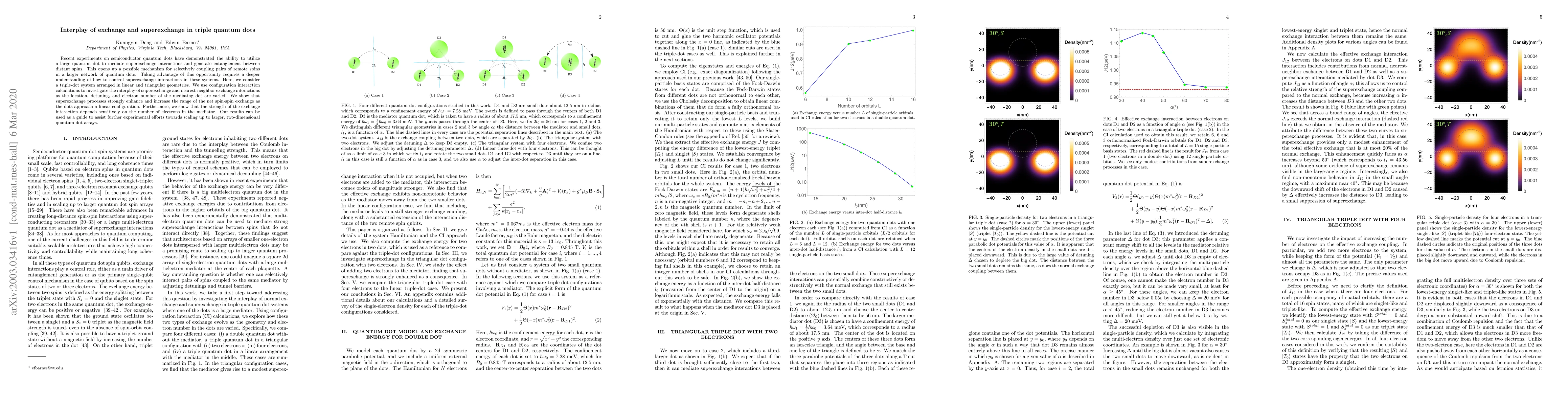 This paper investigates the interplay between superexchange and nearest-neighbor exchange interactions in triple quantum dot systems, finding that superexchange significantly enhances spin-spin exchange, especially in linear configurations. The study highlights the sensitivity of exchange interaction strength to the number of electrons in the mediating dot, providing insights for scaling up quantum dot networks.