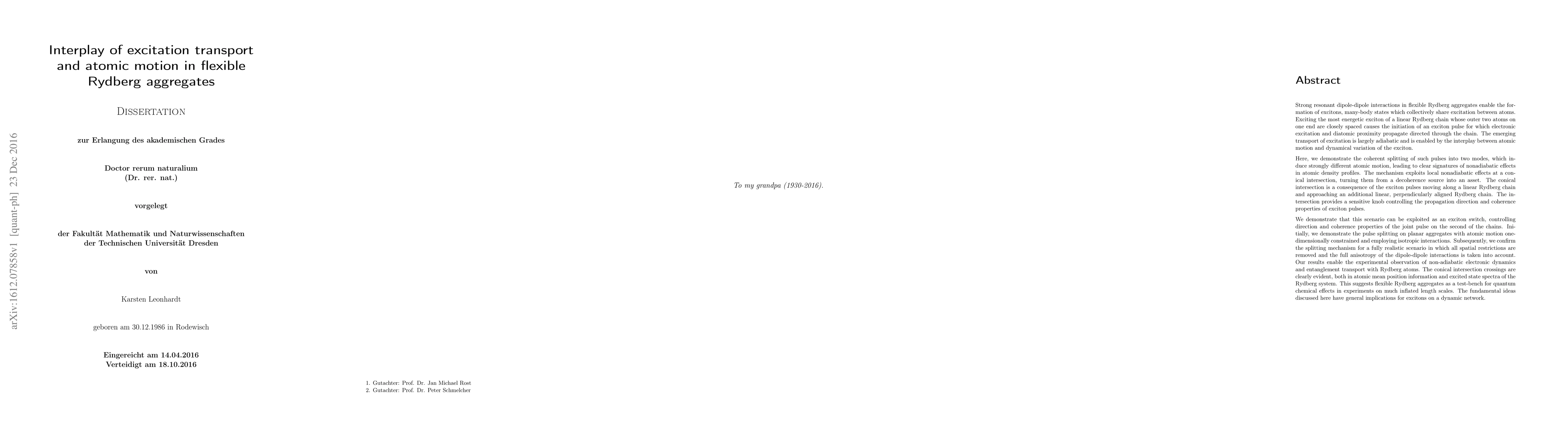 This paper investigates the interplay between excitation transport and atomic motion in flexible Rydberg aggregates, demonstrating coherent exciton pulse splitting and nonadiabatic effects. The study shows how conical intersections can be exploited to control exciton dynamics, enabling the use of Rydberg aggregates as a platform for observing quantum chemical effects on larger scales.