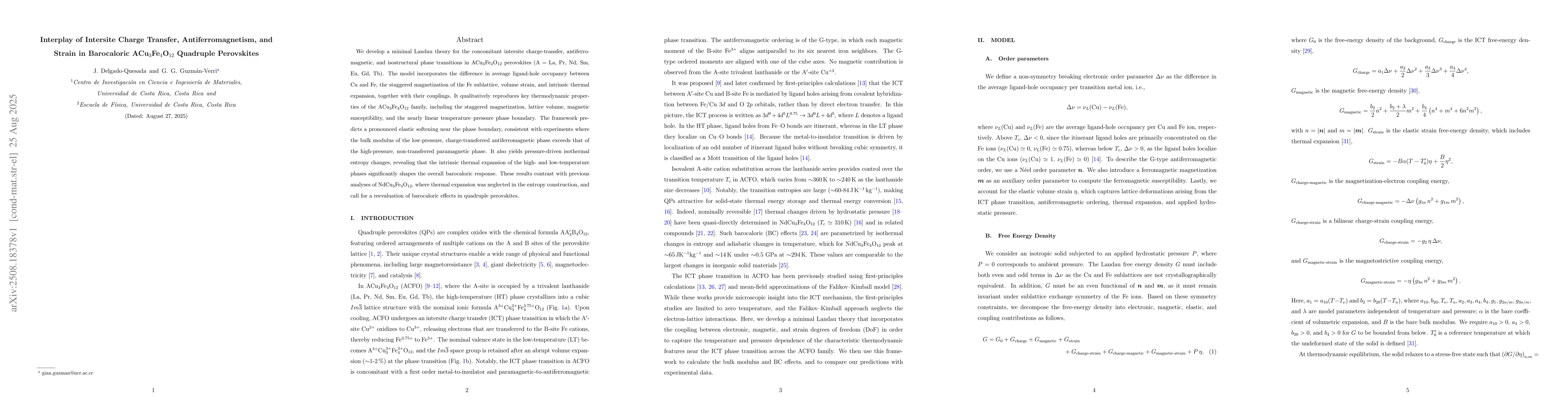 We develop a minimal Landau theory for the concomitant intersite charge-transfer, antiferromagnetic, and isostructural phase transitions in ACu$_3$Fe$_4$O$_{12}$ perovskites (A = La, Pr, Nd, Sm, Eu, Gd, Tb). The model incorporates the difference in average ligand-hole occupancy between Cu and Fe, the staggered magnetization of the Fe sublattice, volume strain, and intrinsic thermal expansion, together with their couplings. It qualitatively reproduces key thermodynamic properties of the ACu$_3$Fe$_4$O$_{12}$ family, including the staggered magnetization, lattice volume, magnetic susceptibility, and the nearly linear temperature-pressure phase boundary. The framework predicts a pronounced elastic softening near the phase boundary, consistent with experiments where the bulk modulus of the low-pressure, charge-transferred antiferromagnetic phase exceeds that of the high-pressure, non-transferred paramagnetic phase. It also yields pressure-driven isothermal entropy changes, revealing that the intrinsic thermal expansion of the high- and low-temperature phases significantly shapes the overall barocaloric response. These results contrast with previous analyses of NdCu$_3$Fe$_4$O$_{12}$, where thermal expansion was neglected in the entropy construction, and call for a reevaluation of barocaloric effects in quadruple perovskites.