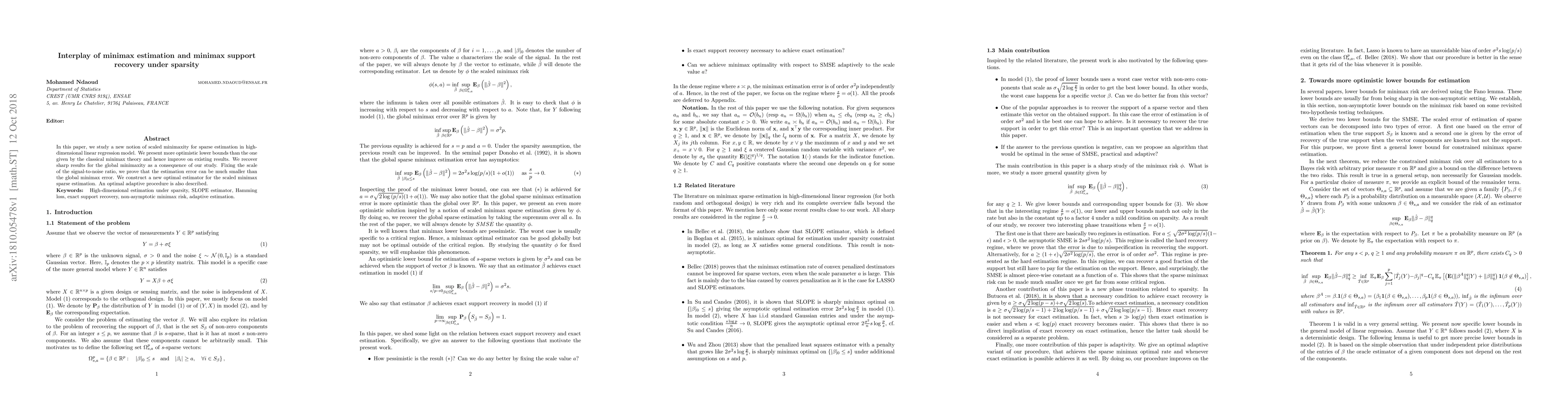 This paper introduces a new concept of scaled minimaxity for sparse estimation in high-dimensional linear regression, presenting improved lower bounds over classical minimax theory. It constructs a new optimal estimator and describes an adaptive procedure, demonstrating that estimation error can be significantly smaller than the global minimax error under fixed signal-to-noise ratios.