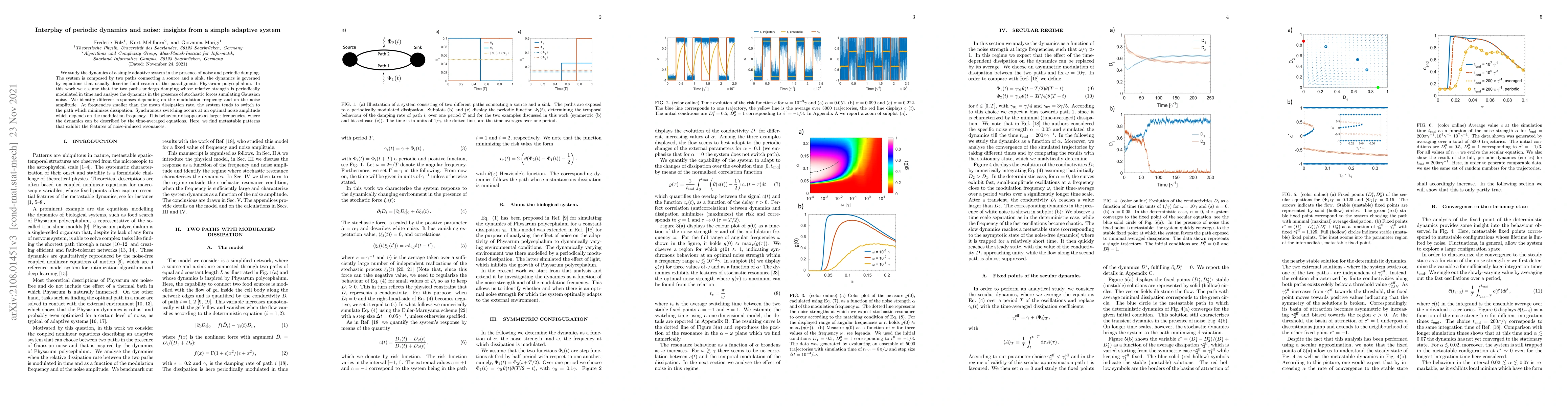 We study the dynamics of a simple adaptive system in the presence of noise and periodic damping. The system is composed by two paths connecting a source and a sink, the dynamics is governed by equations that usually describe food search of the paradigmatic Physarum polycephalum. In this work we assume that the two paths undergo damping whose relative strength is periodically modulated in time and analyse the dynamics in the presence of stochastic forces simulating Gaussian noise. We identify different responses depending on the modulation frequency and on the noise amplitude. At frequencies smaller than the mean dissipation rate, the system tends to switch to the path which minimizes dissipation. Synchronous switching occurs at an optimal noise amplitude which depends on the modulation frequency. This behaviour disappears at larger frequencies, where the dynamics can be described by the time-averaged equations. Here, we find metastable patterns that exhibit the features of noise-induced resonances.