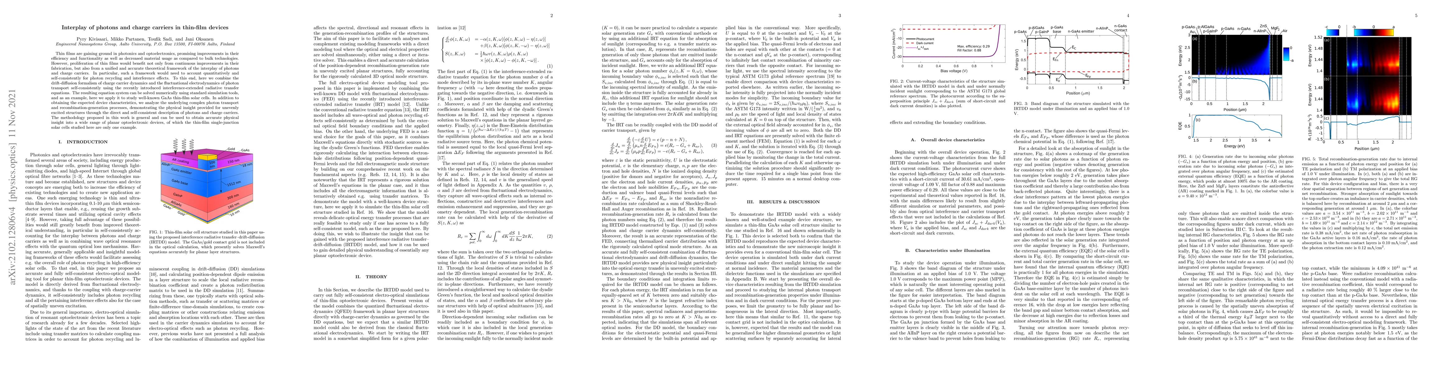 This research presents a unified theoretical framework for understanding photon and charge carrier interactions in thin-film devices, combining drift-diffusion and fluctuational electrodynamics. Applied to GaAs solar cells, it accurately predicts device characteristics and provides insight into complex photon transport and recombination-generation processes, offering a methodology applicable to various planar optoelectronic devices.