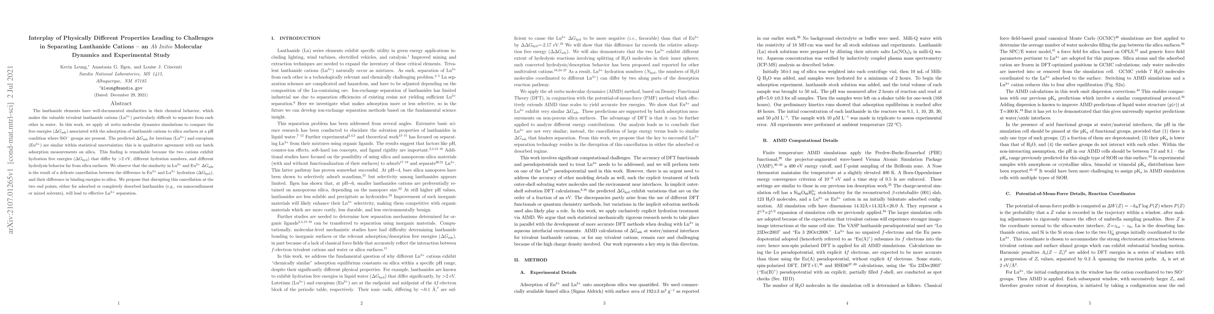 This study combines ab initio molecular dynamics simulations and experimental batch adsorption measurements to explore the separation challenges of lanthanide cations. The research reveals a surprising similarity in adsorption free energies for lutetium and europium despite significant differences in their hydration properties, suggesting a delicate balance in their interactions with silica surfaces.