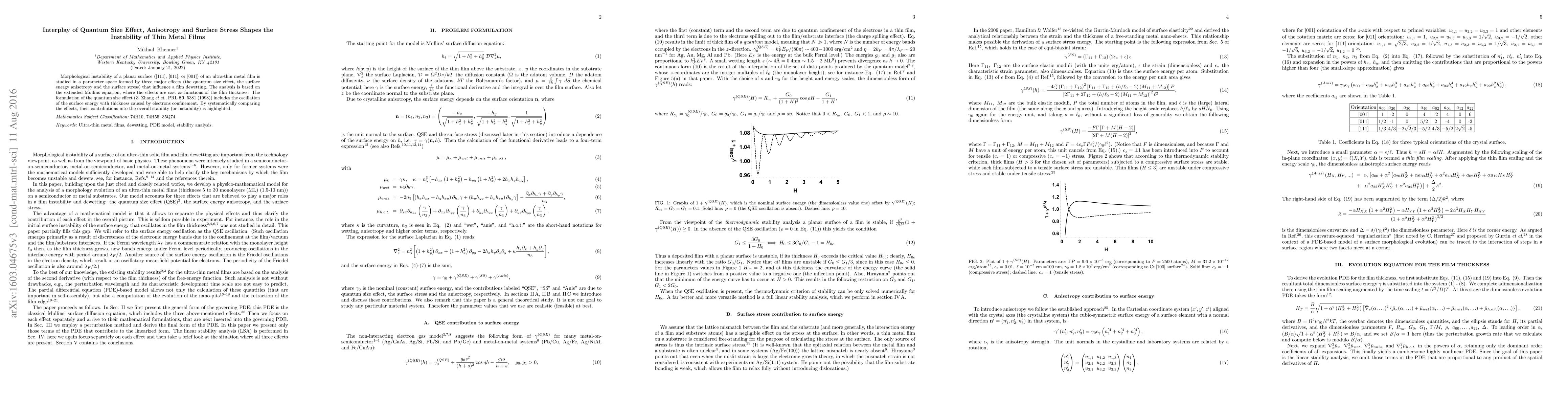 Morphological instability of a planar surface ([111], [011], or [001]) of an ultra-thin metal film is studied in a parameter space formed by three major effects (the quantum size effect, the surface energy anisotropy and the surface stress) that influence a film dewetting. The analysis is based on the extended Mullins equation, where the effects are cast as functions of the film thickness. The formulation of the quantum size effect (Z. Zhang et al., PRL 80, 5381 (1998)) includes the oscillation of the surface energy with thickness caused by electrons confinement. By systematically comparing the effects, their contributions into the overall stability (or instability) is highlighted.