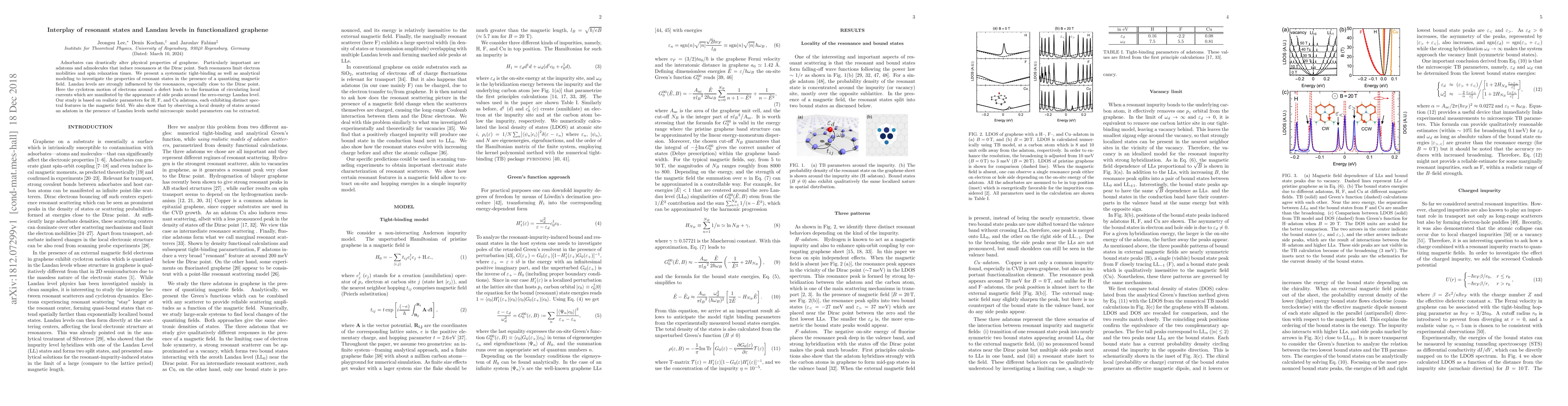 Adsorbates can drastically alter physical properties of graphene. Particularly important are adatoms and admolecules that induce resonances at the Dirac point. Such resonances limit electron mobilities and spin relaxation times. We present a systematic tight-binding as well as analytical modeling to investigate the properties of resonant states in the presence of a quantizing magnetic field. Landau levels are strongly influenced by the resonances, especially close to the Dirac point. Here the cyclotron motion of electrons around a defect leads to the formation of circulating local currents which are manifested by the appearance of side peaks around the zero-energy Landau level. Our study is based on realistic parameters for H, F, and Cu adatoms, each exhibiting distinct spectral features in the magnetic field. We also show that by observing a local density of states around an adatom in the presence of Landau levels useful microscopic model parameters can be extracted.