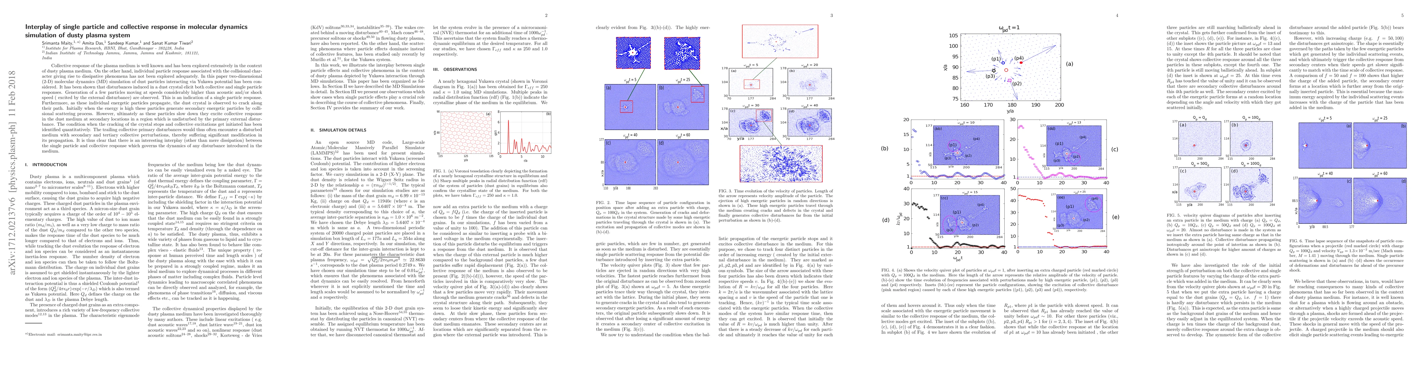 This paper investigates the interplay between single particle and collective responses in dusty plasma systems via 2D molecular dynamics simulations. The study reveals that energetic particles generated by collisional interactions can induce both individual and collective medium responses, ultimately affecting the dynamics and shock formation in the plasma.