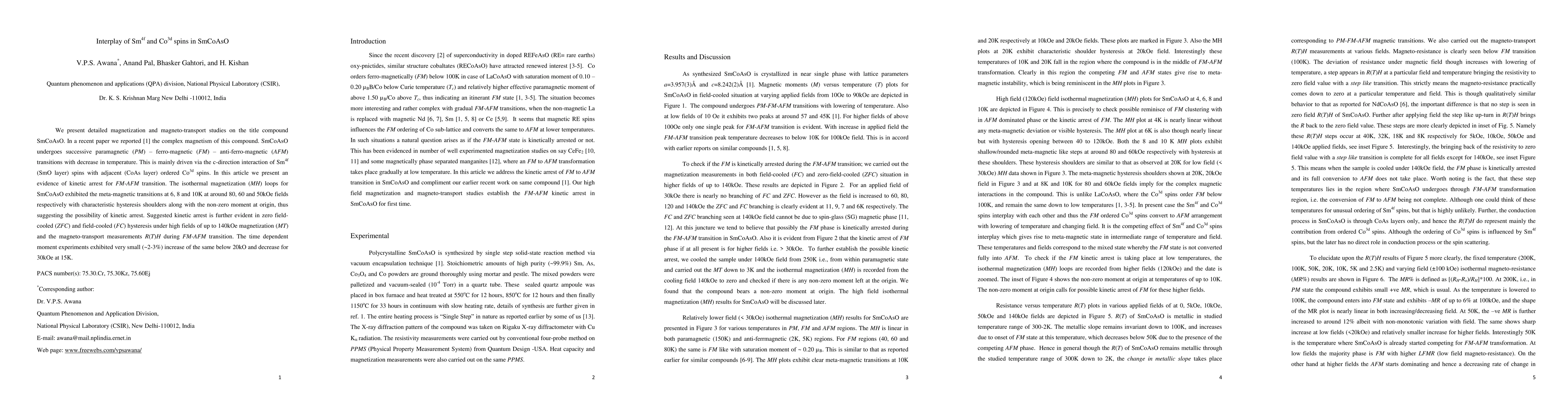 We present detailed magnetization and magneto-transport studies on the title compound SmCoAsO. In a recent paper we reported [1] the complex magnetism of this compound. SmCoAsO undergoes successive paramagnetic (PM) - ferro-magnetic (FM) - anti-ferro-magnetic (AFM) transitions with decrease in temperature. This is mainly driven via the c-direction interaction of Sm4f (SmO layer) spins with adjacent (CoAs layer) ordered Co3d spins. In this article we present an evidence of kinetic arrest for FM-AFM transition. The isothermal magnetization (MH) loops for SmCoAsO exhibited the meta-magnetic transitions at 6, 8 and 10K at around 80, 60 and 50kOe fields respectively with characteristic hysteresis shoulders along with the non-zero moment at origin, thus suggesting the possibility of kinetic arrest. Suggested kinetic arrest is further evident in zero field-cooled (ZFC) and field-cooled (FC) hysteresis under high fields of up to 140kOe magnetization (MT) and the magneto-transport measurements R(T)H during FM-AFM transition. The time dependent moment experiments exhibited very small (~2-3%) increase of the same below 20kO and decrease for 30kOe at 15K.