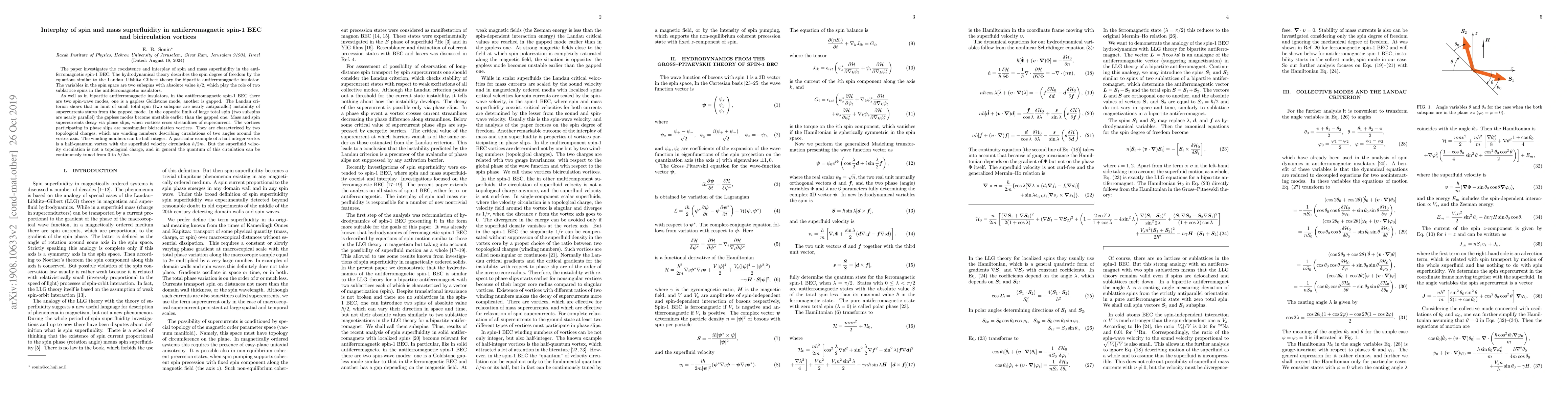The paper investigates the coexistence and interplay of spin and mass superfluidity in the antiferromagnetic spin-1 BEC. The hydrodynamical theory describes the spin degree of freedom by the equations similar to the Landau--Lifshitz--Gilbert theory for bipartite antiferromagnetic insulator. The variables in the spin space are two subspins with absolute value $\hbar/2$, which play the role of two sublattice spins in the antiferromagnetic insulators. As well as in bipartite antiferromagnetic insulators, in the antiferromagnetic spin-1 BEC there are two spin-wave modes, one is a gapless Goldstone mode, another is gapped. The Landau criterion shows that in limit of small total spin (two subspins are nearly antiparallel) instability of supercurrents starts from the gapped mode. In the opposite limit of large total spin (two subspins are nearly parallel) the gapless modes become unstable earlier than the gapped one. Mass and spin supercurrents decay via phase slips, when vortices cross streamlines of supercurrent. The vortices participating in phase slips are nonsingular bicirculation vortices. They are characterized by two topological charges, which are winding numbers describing circulations of two angles around the vortex axis. The winding numbers can be half-integer. A particular example of a half-integer vortex is a half-quantum vortex with the superfluid velocity circulation $h/2m$. But the superfluid velocity circulation is not a topological charge, and in general the quantum of this circulation can be continuously tuned from 0 to $h/2m$.