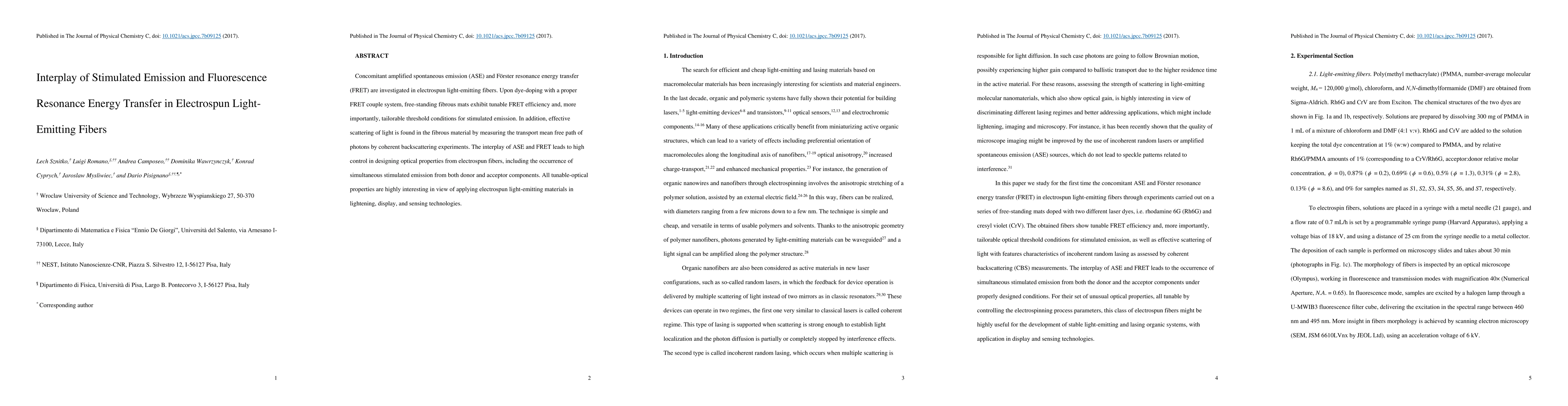 This paper investigates the combined effects of amplified spontaneous emission and Förster resonance energy transfer in electrospun light-emitting fibers, revealing tunable FRET efficiency and threshold conditions for stimulated emission. The study highlights the potential for designing optical properties in electrospun fibers for applications in lighting, displays, and sensing.