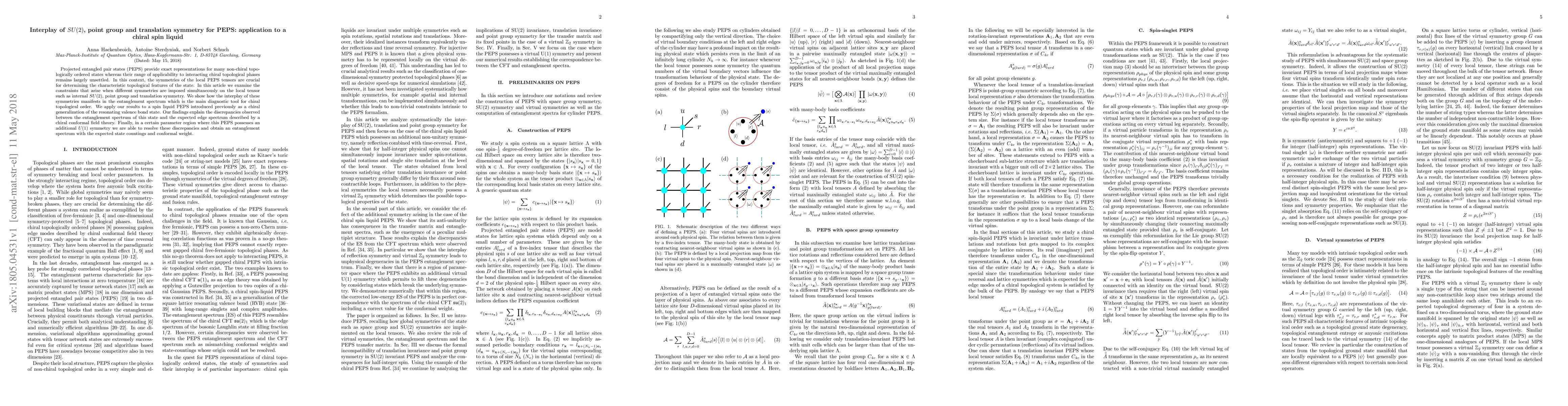 Projected entangled pair states (PEPS) provide exact representations for many non-chiral topologically ordered states whereas their range of applicability to interacting chiral topological phases remains largely unsettled. In this context, the symmetries of the local PEPS tensors are crucial for determining the characteristic topological features of the state. In this article we examine the constraints that arise when different symmetries are imposed simultaneously on the local tensor such as internal $SU(2)$, point group and translation symmetry. We show how the interplay of these symmetries manifests in the entanglement spectrum which is the main diagnostic tool for chiral topological order. We apply our results to a spin liquid PEPS introduced previously as a chiral generalization of the resonating valence bond state. Our findings explain the discrepancies observed between the entanglement spectrum of this state and the expected edge spectrum described by a chiral conformal field theory. Finally, in a certain parameter region where this PEPS possesses an additional $U(1)$ symmetry we are able to resolve these discrepancies and obtain an entanglement spectrum with the expected state countings and conformal weight.