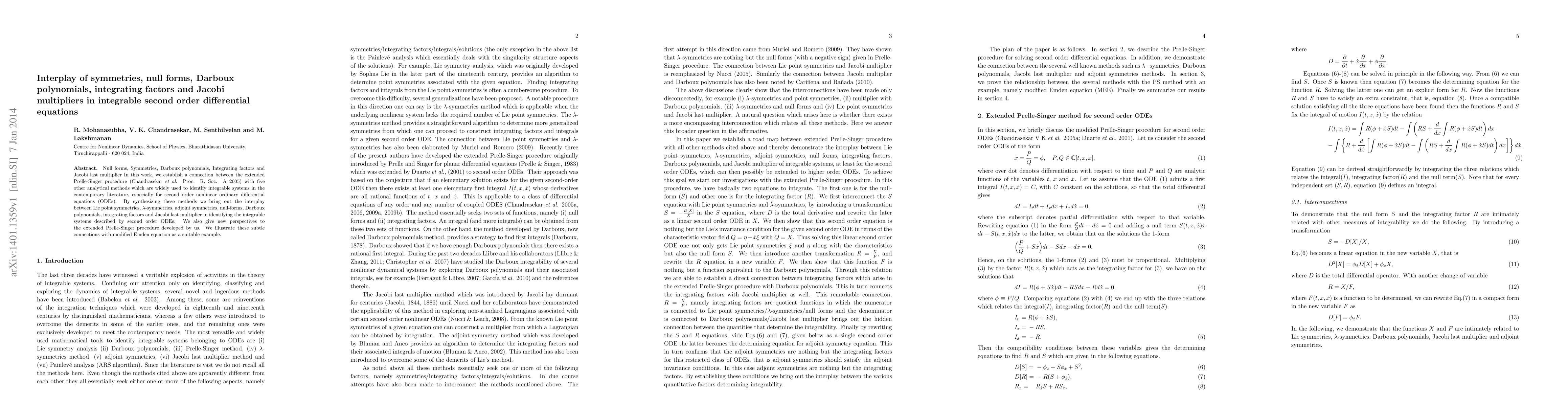 This paper connects the extended Prelle-Singer procedure with five other analytical methods to identify integrable second-order nonlinear ordinary differential equations, highlighting the interplay between various symmetries and polynomials. An example using the modified Emden equation demonstrates these connections.