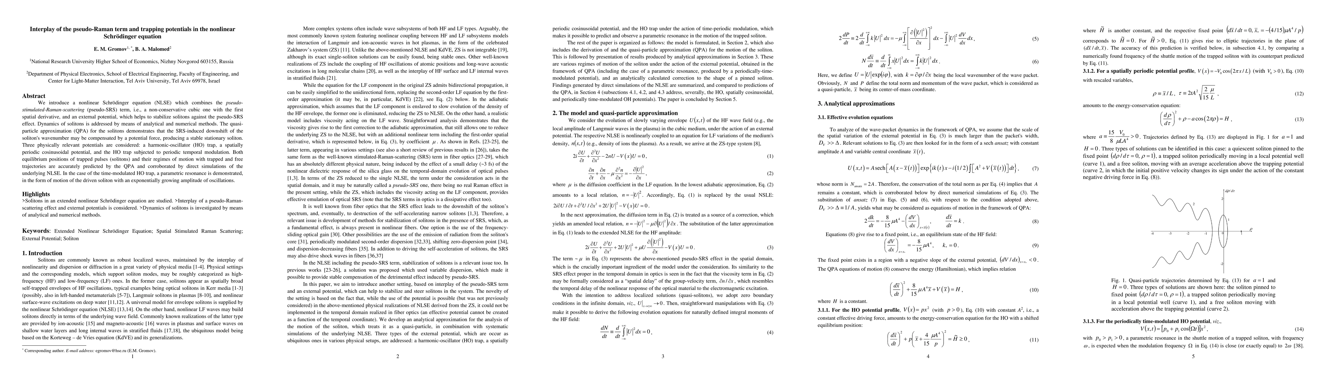This paper investigates a nonlinear Schrödinger equation incorporating pseudo-Raman scattering and trapping potentials, demonstrating how external potentials can stabilize solitons. The quasi-particle approximation reveals stable solitons and predicts their dynamics under various potentials, including harmonic traps and modulated potentials, with corroborative numerical simulations.