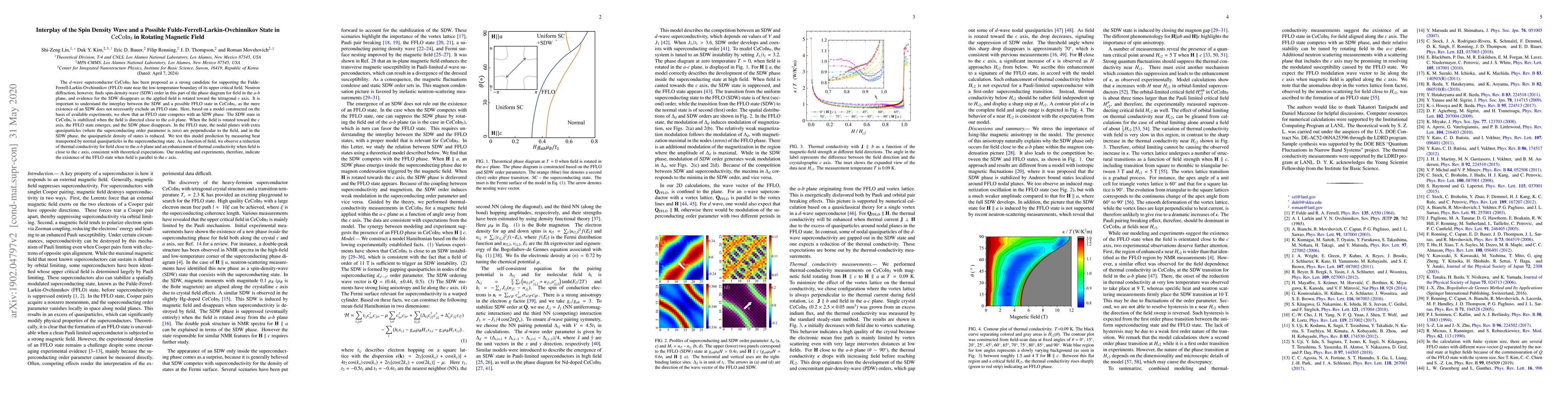 The $d$-wave superconductor $\mathrm{CeCoIn_5}$ has been proposed as a strong candidate for supporting the Fulde-Ferrell-Larkin-Ovchinnikov (FFLO) state near the low-temperature boundary of its upper critical field. Neutron diffraction, however, finds spin-density-wave (SDW) order in this part of the phase diagram for field in the $a$-$b$ plane, and evidence for the SDW disappears as the applied field is rotated toward the tetragonal $c$ axis. It is important to understand the interplay between the SDW and a possible FFLO state in $\mathrm{CeCoIn_5}$, as the mere existence of an SDW does not necessary exclude an FFLO state. Here, based on a model constructed on the basis of available experiments, we show that an FFLO state competes with an SDW phase. The SDW state in $\mathrm{CeCoIn_5}$ is stabilized when the field is directed close to the $a$-$b$ plane. When the field is rotated toward the $c$ axis, the FFLO state emerges, and the SDW phase disappears. In the FFLO state, the nodal planes with extra quasiparticles (where the superconducting order parameter is zero) are perpendicular to the field, and in the SDW phase, the quasiparticle density of states is reduced. We test this model prediction by measuring heat transported by normal quasiparticles in the superconducting state. As a function of field, we observe a reduction of thermal conductivity for field close to the $a$-$b$ plane and an enhancement of thermal conductivity when field is close to the $c$ axis, consistent with theoretical expectations. Our modeling and experiments, therefore, indicate the existence of the FFLO state when field is parallel to the $c$ axis.