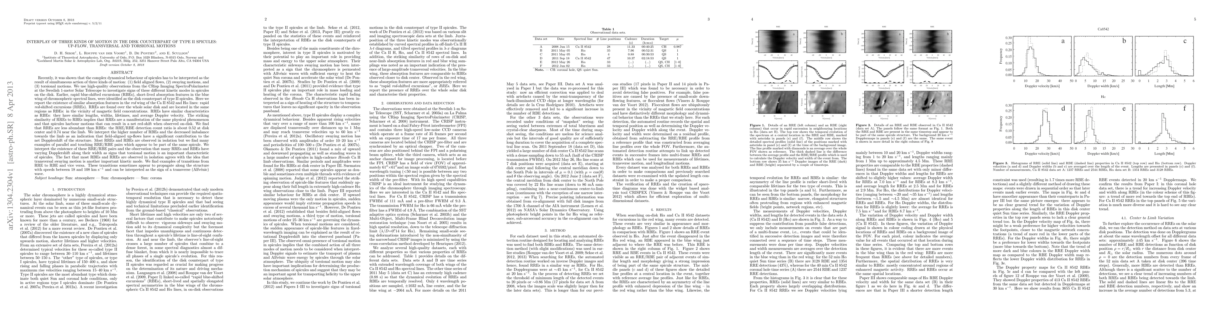 Recently, it was shown that the complex dynamical behaviour of spicules has to be interpreted as the result of simultaneous action of three kinds of motion: (1) field aligned flows, (2) swaying motions, and (3) torsional motions. We use high-quality observations from CRISP at the SST to investigate signs of these different kinetic modes in spicules on the disk. Earlier, rapid blue-shifted excursions (RBEs), short-lived absorption features in the blue wing of chromospheric spectral lines, were identified as the disk counterpart of type II spicules. Here we report the existence of similar absorption features in the red wing of the Ca II 8542 and Halpha lines: rapid red-shifted excursions (RREs). RREs are found over the whole solar disk and are located in the same regions as RBEs: in the vicinity of magnetic field concentrations. RREs have similar characteristics as RBEs: they have similar lengths, widths, lifetimes, and average Doppler velocity. The striking similarity of RREs to RBEs implies that RREs are a manifestation of the same physical phenomenon and that spicules harbour motions that can result in a net red-shift when observed on-disk. We find that RREs are less abundant than RBEs and we interpret the higher number of RBEs and the decreased imbalance towards the limb as an indication that field-aligned up-flows have a significant contribution to the net Dopplershift. Most RREs and RBEs are observed in isolation but we find many examples of parallel and touching RRE/RBE pairs which appear to be part of the same spicule. We interpret the existence of these RRE/RBE pairs as signs that torsional motion is an important characteristic of spicules. The fact that most RBEs and RREs are observed in isolation agrees with the idea that transversal swaying motion is another important kinetic mode. We find examples of transitions from RRE to RBE and vice versa.