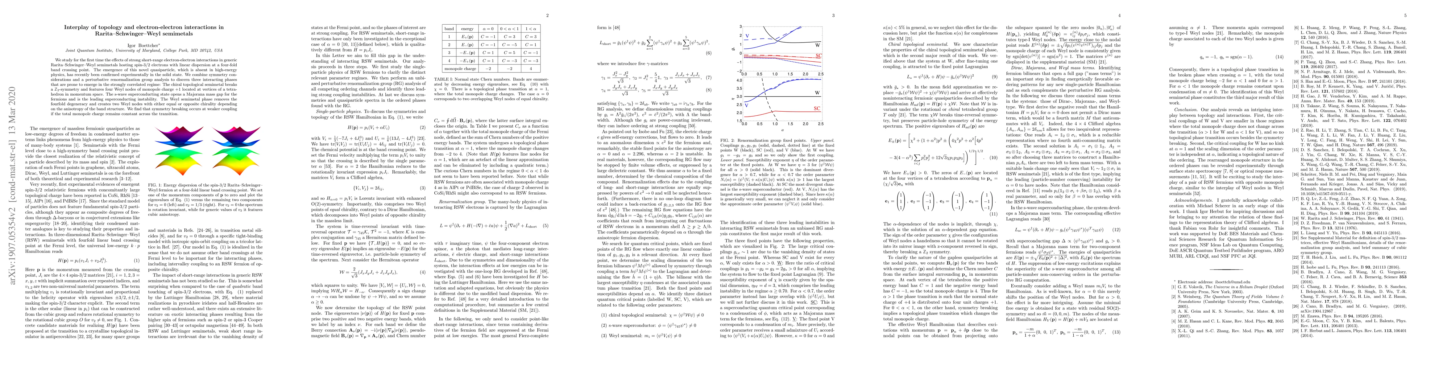 This paper explores the impact of strong electron-electron interactions in Rarita-Schwinger-Weyl semimetals, revealing three interacting phases: a chiral topological semimetal, an s-wave superconductor, and a Weyl semimetal, with the latter dependent on band structure anisotropy. Symmetry considerations and renormalization group analysis guide the identification of these phases.