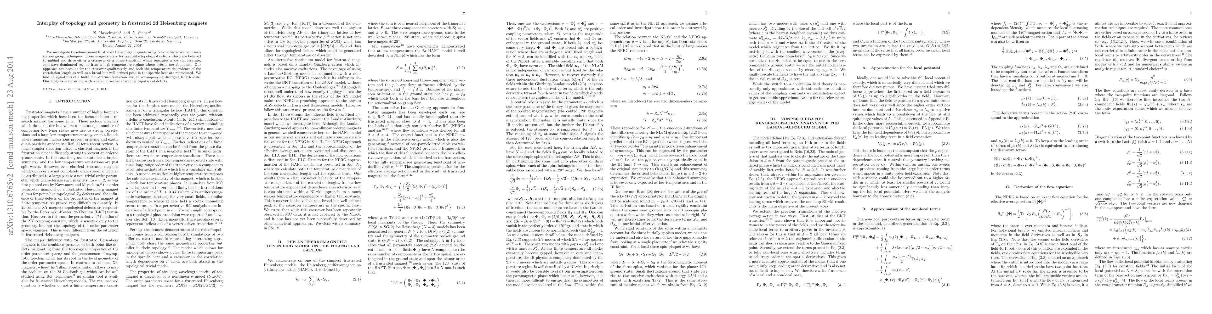 This study employs non-perturbative renormalization group techniques to explore two-dimensional frustrated Heisenberg magnets, revealing that topological defects drive a rapid crossover rather than a phase transition, separating spin-wave dominated low-temperature regimes from defect-rich high-temperature regimes. The analysis shows no evidence of a finite temperature transition, supporting a crossover driven by topological defects.