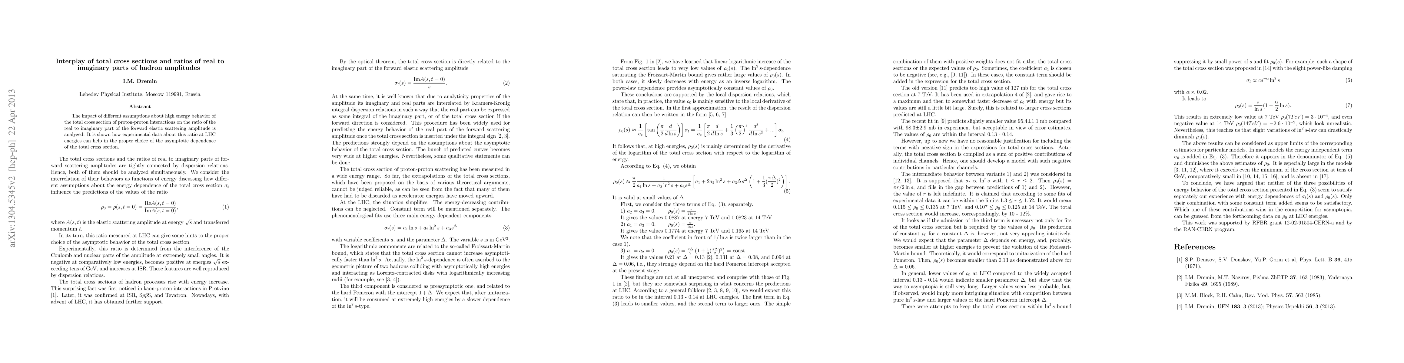 Summary: This paper investigates how varying assumptions about the high-energy behavior of proton-proton total cross sections affect the ratio of real to imaginary parts of forward elastic scattering amplitudes. It demonstrates that LHC energy data on this ratio can guide the selection of the correct asymptotic total cross section dependence.