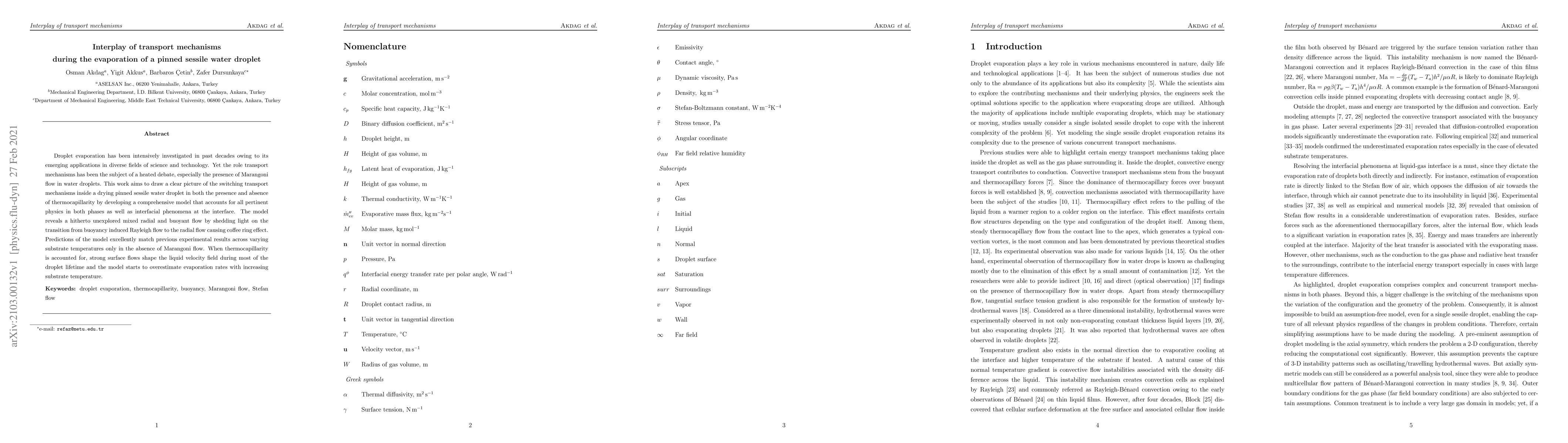 This research develops a comprehensive model to elucidate the interplay of transport mechanisms during the evaporation of pinned sessile water droplets, revealing a transition from buoyancy-driven to radial flow and the influence of Marangoni effects on evaporation rates. The model's predictions match experimental data in the absence of thermocapillarity but overestimate rates with increasing temperature when Marangoni flow is considered.