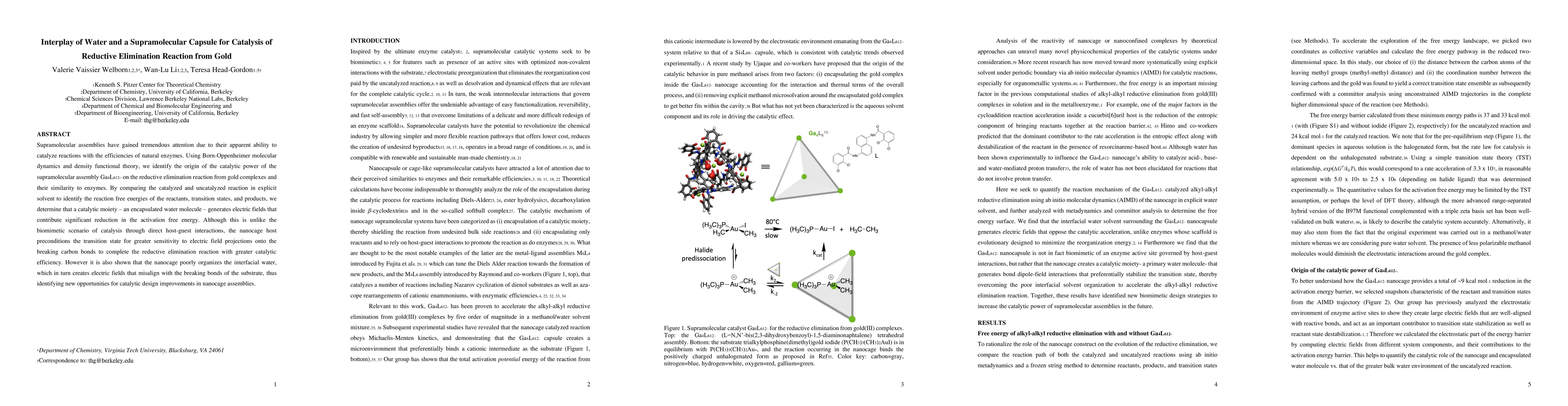 This study uses molecular dynamics and density functional theory to reveal that a water molecule encapsulated within a Ga-based supramolecular assembly plays a crucial role in catalyzing reductive elimination reactions from gold complexes. The assembly generates electric fields reducing activation energy, though its organization of interfacial water can misalign electric fields with breaking substrate bonds, offering insights for improving catalytic design in nanocage assemblies.