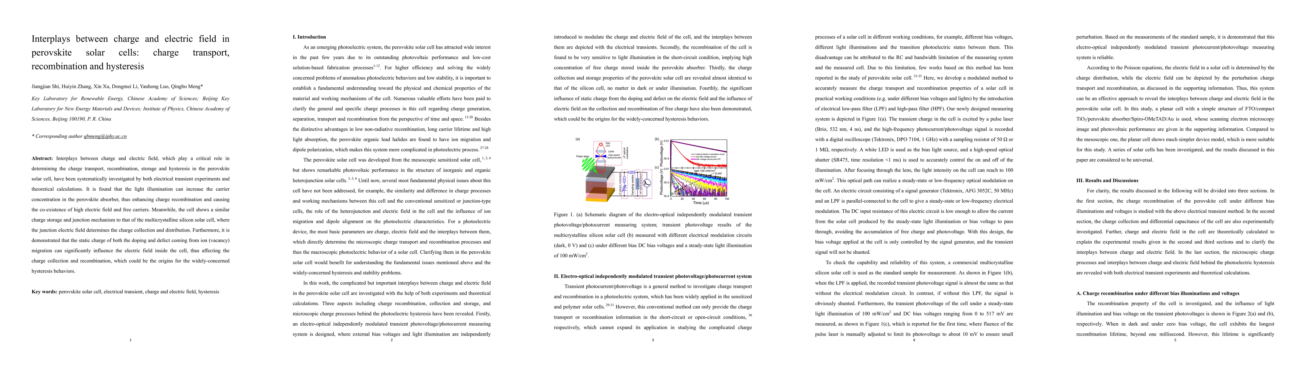 This paper investigates how charge transport, recombination, and hysteresis in perovskite solar cells are influenced by the interplay between charge and electric field. Findings reveal that light illumination enhances carrier concentration, affecting recombination and electric field dynamics, while static charge from doping and defects due to ion migration significantly impacts the electric field, contributing to hysteresis behavior.