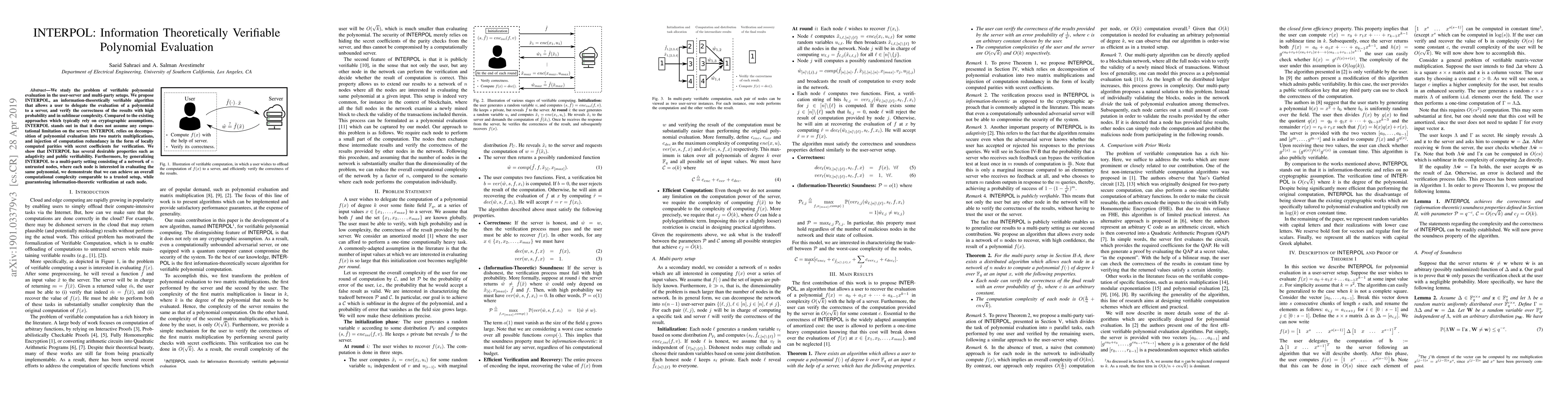 The paper proposes {INTERPOL}, an information-theoretically verifiable algorithm for polynomial evaluation in user-server and multi-party settings, achieving sublinear complexity without relying on computational assumptions. It uses matrix decomposition and locally computed parities for verification.
