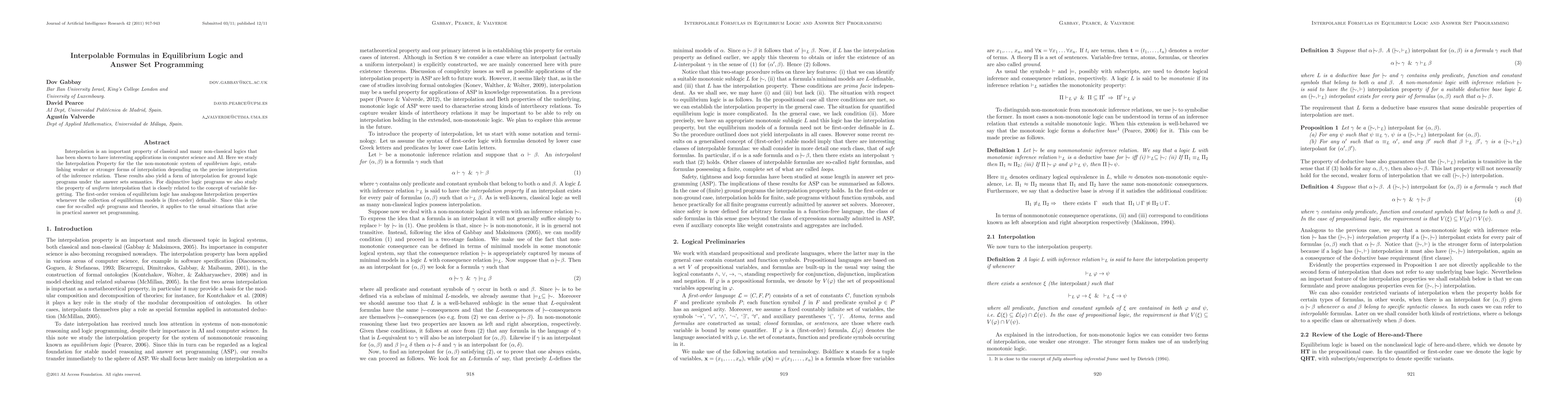 This paper investigates the Interpolation Property in equilibrium logic and its implications for Answer Set Programming, establishing various forms of interpolation for non-monotonic logic and disjunctive logic programs. It also extends these results to first-order versions, particularly for safe programs, relevant in practical applications.