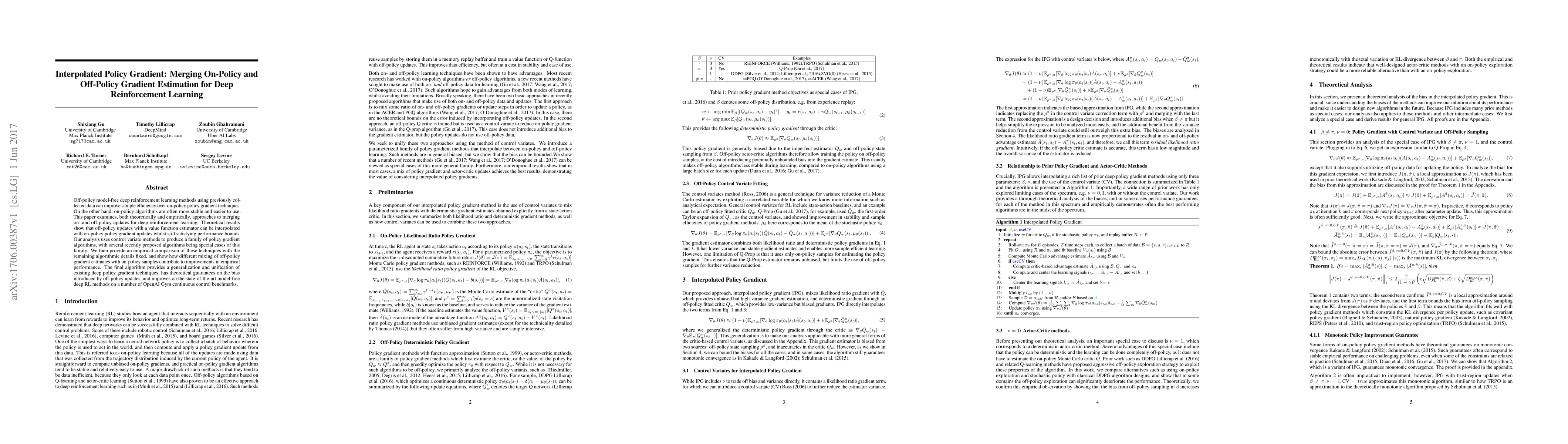 This paper proposes a new deep reinforcement learning algorithm that merges on-policy and off-policy gradient updates, achieving both improved sample efficiency and stability. Theoretical and empirical analyses demonstrate the effectiveness of this interpolated policy gradient approach, outperforming existing methods on continuous control tasks.