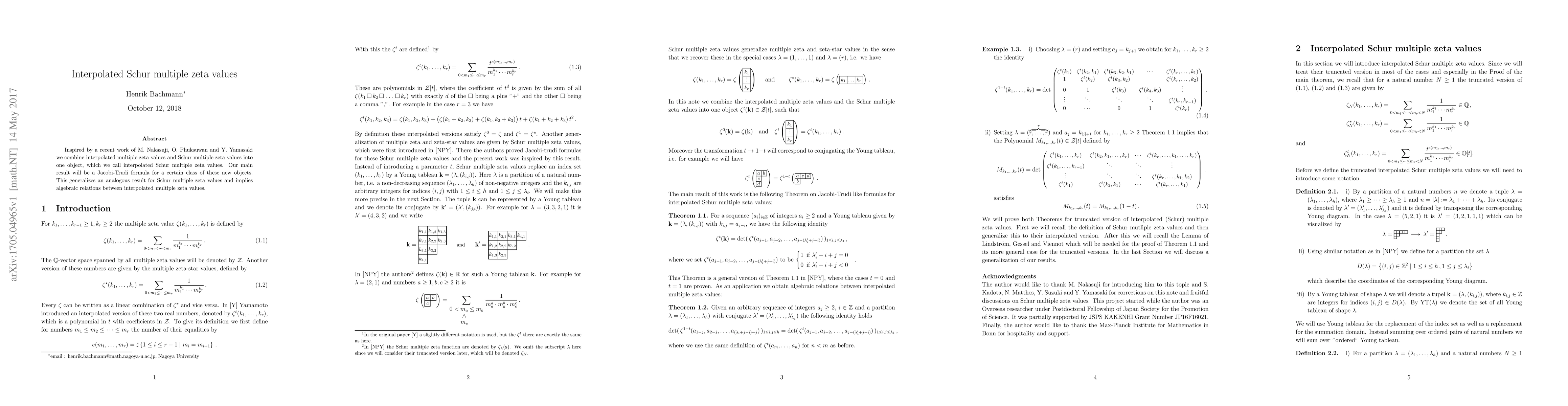 This paper introduces interpolated Schur multiple zeta values, combining interpolated multiple zeta values and Schur multiple zeta values, and presents a Jacobi-Trudi formula for these new objects, generalizing previous results and revealing algebraic relations among interpolated multiple zeta values.