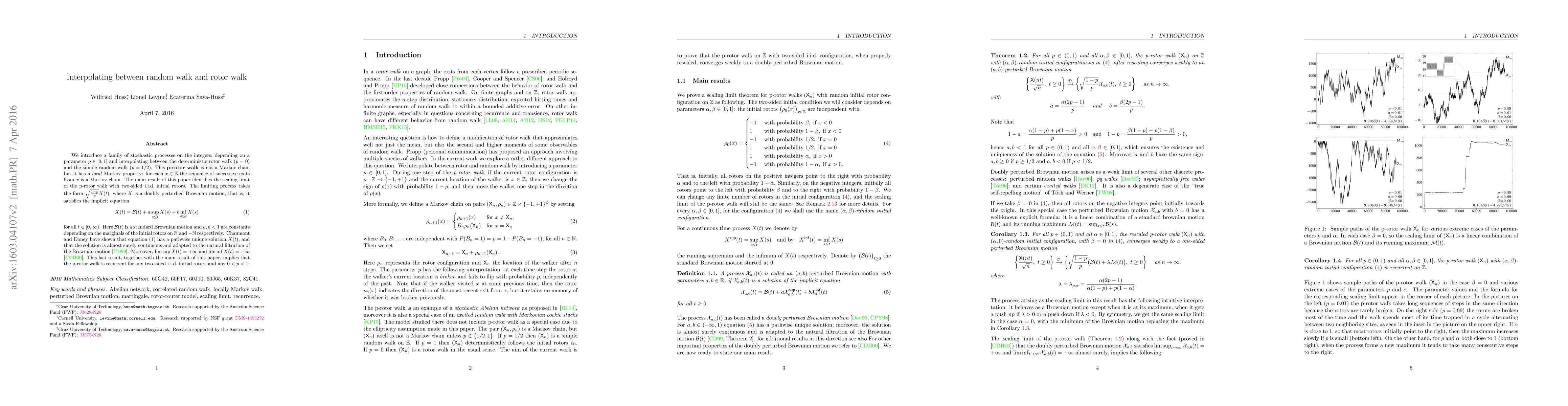 We introduce a family of stochastic processes on the integers, depending on a parameter $p \in [0,1]$ and interpolating between the deterministic rotor walk (p=0) and the simple random walk (p=1/2). This p-rotor walk is not a Markov chain but it has a local Markov property: for each $x \in \mathbb{Z}$ the sequence of successive exits from $x$ is a Markov chain. The main result of this paper identifies the scaling limit of the p-rotor walk with two-sided i.i.d. initial rotors. The limiting process takes the form $\sqrt{\frac{1-p}{p}} X(t)$, where $X$ is a doubly perturbed Brownian motion, that is, it satisfies the implicit equation \begin{equation} X(t) = \mathcal{B}(t) + a \sup_{s\leq t} X(s) + b \inf_{s\leq t} X(s) \end{equation} for all $t \in [0,\infty)$. Here $\mathcal{B}(t)$ is a standard Brownian motion and $a,b<1$ are constants depending on the marginals of the initial rotors on $\mathbb{N}$ and $-\mathbb{N}$ respectively. Chaumont and Doney [CD99] have shown that the above equation has a pathwise unique solution $X(t)$, and that the solution is almost surely continuous and adapted to the natural filtration of the Brownian motion. Moreover, $\limsup X(t) = +\infty$ and $\liminf X(t) = -\infty$ [CDH00]. This last result, together with the main result of this paper, implies that the p-rotor walk is recurrent for any two-sided i.i.d. initial rotors and any $0
