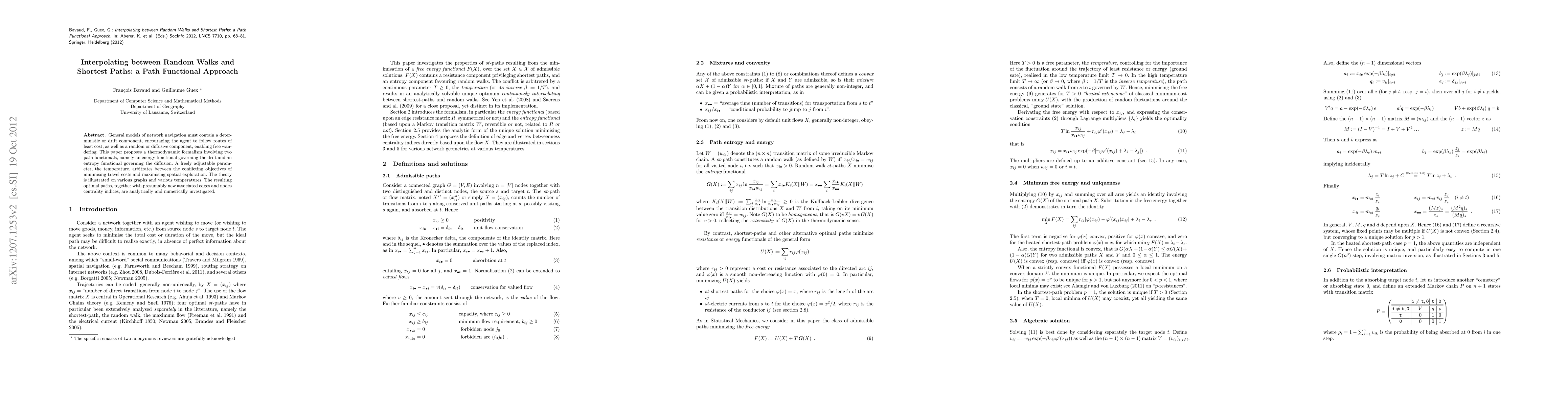 General models of network navigation must contain a deterministic or drift component, encouraging the agent to follow routes of least cost, as well as a random or diffusive component, enabling free wandering. This paper proposes a thermodynamic formalism involving two path functionals, namely an energy functional governing the drift and an entropy functional governing the diffusion. A freely adjustable parameter, the temperature, arbitrates between the conflicting objectives of minimising travel costs and maximising spatial exploration. The theory is illustrated on various graphs and various temperatures. The resulting optimal paths, together with presumably new associated edges and nodes centrality indices, are analytically and numerically investigated.