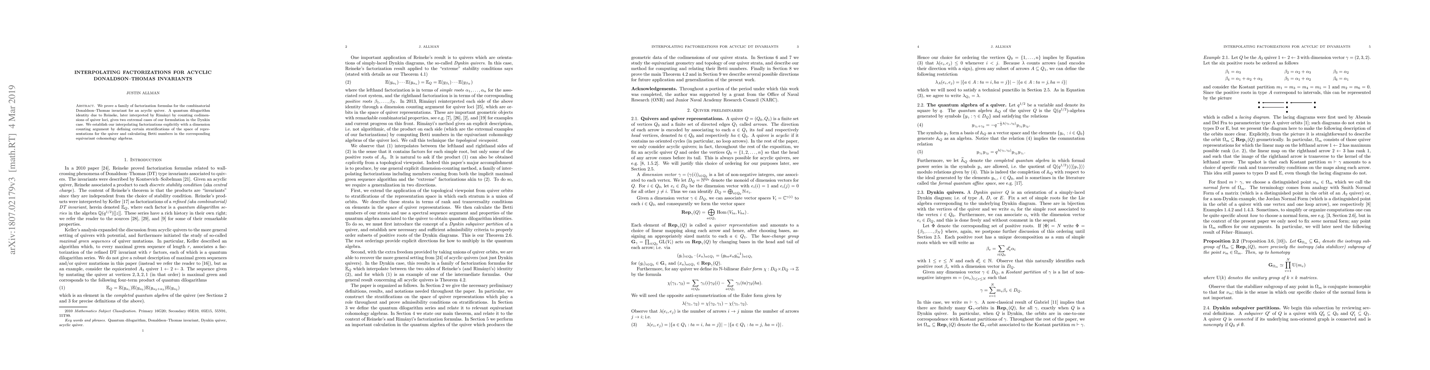 We prove a family of factorization formulas for the combinatorial Donaldson--Thomas invariant for an acyclic quiver. A quantum dilogarithm identity due to Reineke, later interpreted by Rimanyi by counting codimensions of quiver loci, gives two extremal cases of our formulation in the Dynkin case. We establish our interpolating factorizations explicitly with a dimension counting argument by defining certain stratifications of the space of representations for the quiver and calculating Betti numbers in the corresponding equivariant cohomology algebras.