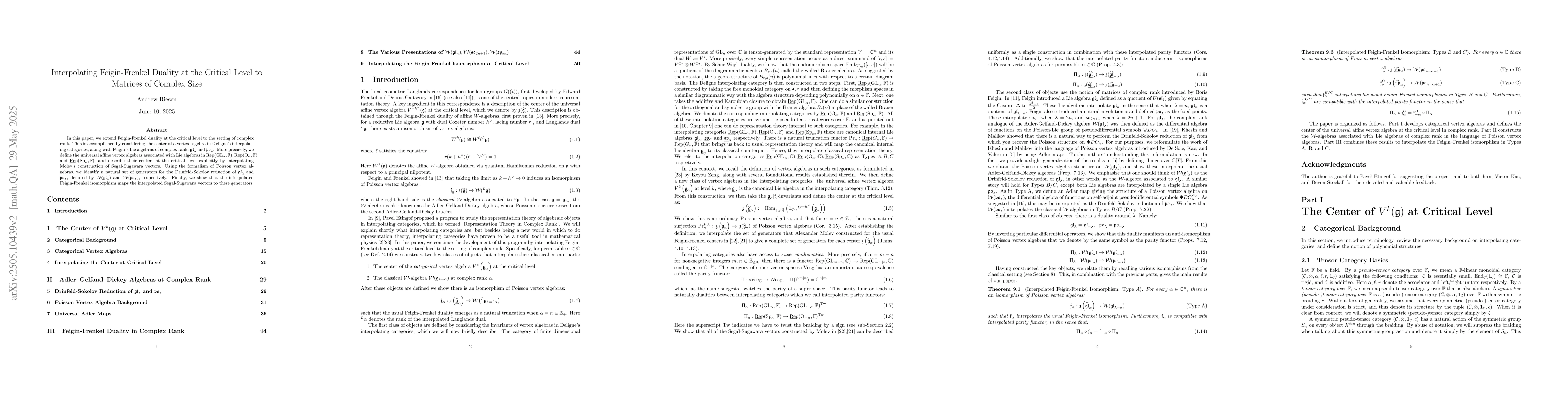 The development of a framework for interpolating Feigin-Frenkel duality at the critical level to complex rank, including the description of centers and generators for related vertex algebras.