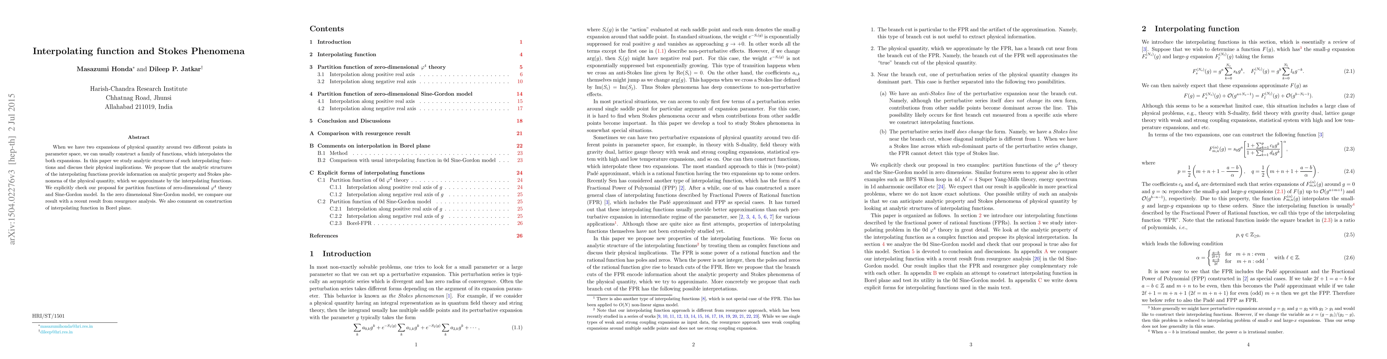 This paper investigates the analytic structures of interpolating functions that bridge two expansions of a physical quantity around different points in parameter space, proposing that these structures reveal information on the analytic properties and Stokes phenomena of the quantity. The study is exemplified through partition functions in zero-dimensional $\varphi^4$ theory and the Sine-Gordon model, with a comparison to resurgence analysis results.