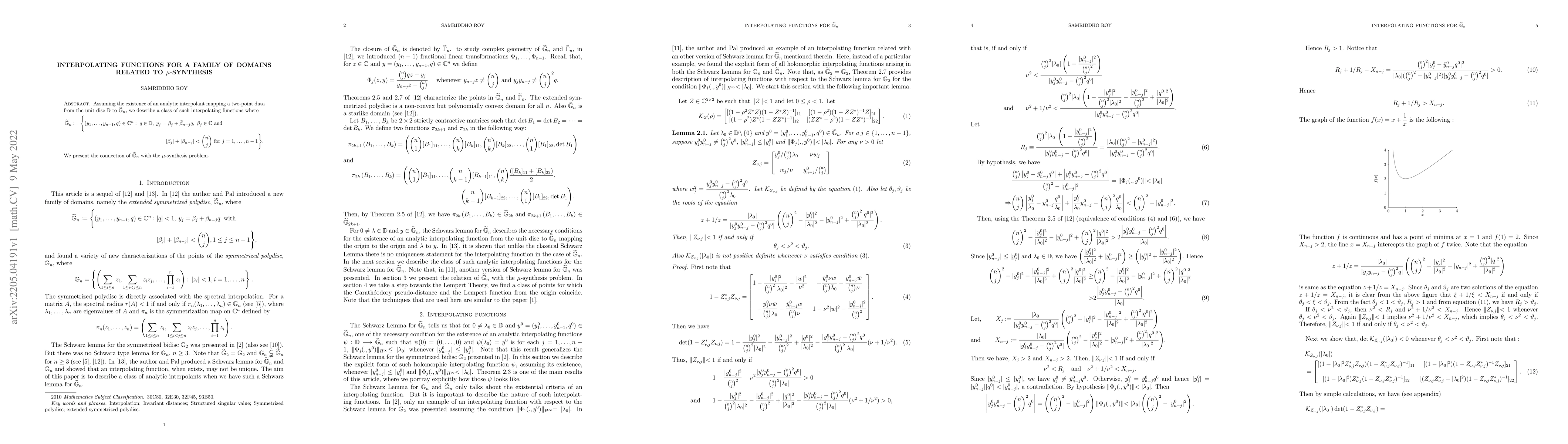 This paper explores analytic interpolants mapping data from the unit disc to a complex domain $\widetilde{\mathbb{G}}_n$, establishing a class of interpolating functions. It connects $\widetilde{\mathbb{G}}_n$ with the $\mu$-synthesis problem, highlighting the relevance of these functions in control theory.