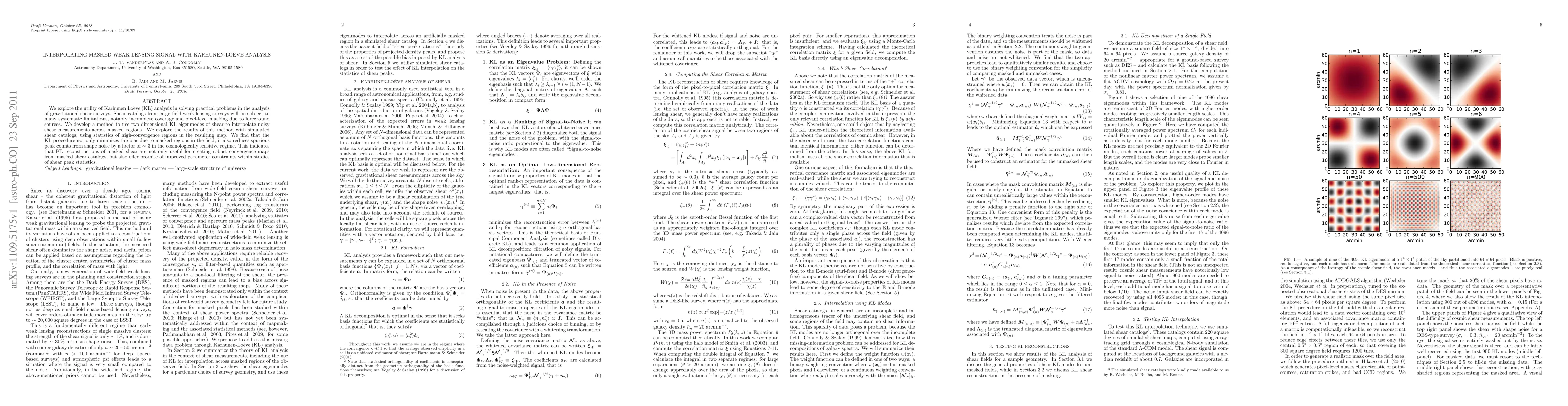 We explore the utility of Karhunen Loeve (KL) analysis in solving practical problems in the analysis of gravitational shear surveys. Shear catalogs from large-field weak lensing surveys will be subject to many systematic limitations, notably incomplete coverage and pixel-level masking due to foreground sources. We develop a method to use two dimensional KL eigenmodes of shear to interpolate noisy shear measurements across masked regions. We explore the results of this method with simulated shear catalogs, using statistics of high-convergence regions in the resulting map. We find that the KL procedure not only minimizes the bias due to masked regions in the field, it also reduces spurious peak counts from shape noise by a factor of ~ 3 in the cosmologically sensitive regime. This indicates that KL reconstructions of masked shear are not only useful for creating robust convergence maps from masked shear catalogs, but also offer promise of improved parameter constraints within studies of shear peak statistics.
