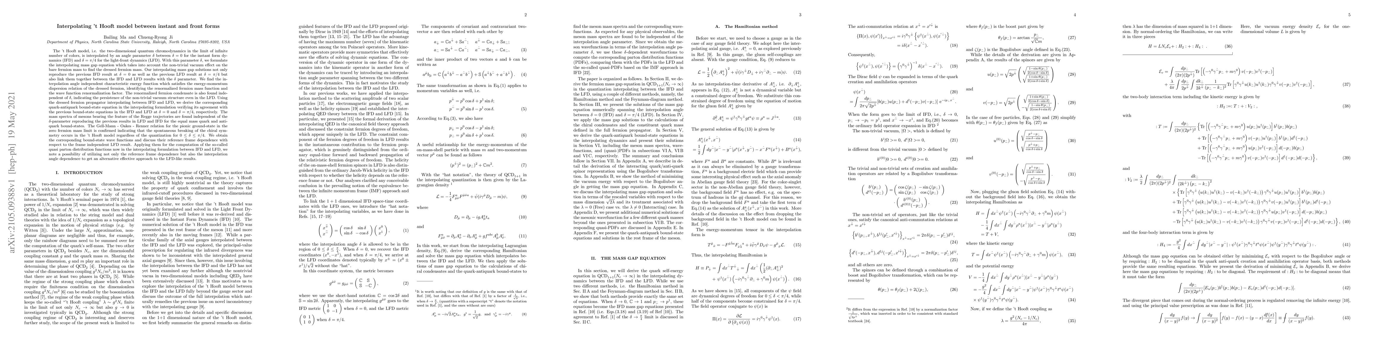 The 't Hooft model, i.e. the two-dimensional quantum chromodynamics in the limit of infinite number of colors, is interpolated by an angle parameter $\delta$ between $\delta=0$ for the instant form dynamics (IFD) and $\delta=\pi/4$ for the light-front dynamics (LFD). With this parameter $\delta$, we formulate the interpolating mass gap equation which takes into account the non-trivial vacuum effect on the bare fermion mass to find the dressed fermion mass. Our interpolating mass gap solutions link the IFD and LFD results with the $\delta$ parameter. We find the interpolation angle independent characteristic energy function which satisfies the energy-momentum dispersion relation of the dressed fermion, identifying the renormalized fermion mass function and the wave function renormalization factor. Using the dressed fermion propagator interpolating between IFD and LFD, we derive the corresponding quark-antiquark bound-state equation in the interpolating formulation. The mass spectra of mesons bearing the feature of the Regge trajectories are found independent of the $\delta$-parameter for the equal mass quark and antiquark bound-states. The Gell-Mann - Oakes - Renner relation for the pionic ground-state in the zero fermion mass limit is confirmed indicating that the spontaneous breaking of the chiral symmetry occurs regardless of the quantization for $0 \le \delta \le \pi/4$. We obtain the corresponding bound-state wave functions and discuss their reference frame dependence. Applying them for the computation of the so-called quasi parton distribution functions, we note a possibility of utilizing not only the reference frame dependence but also the interpolation angle dependence to get an alternative effective approach to the LFD-like results.