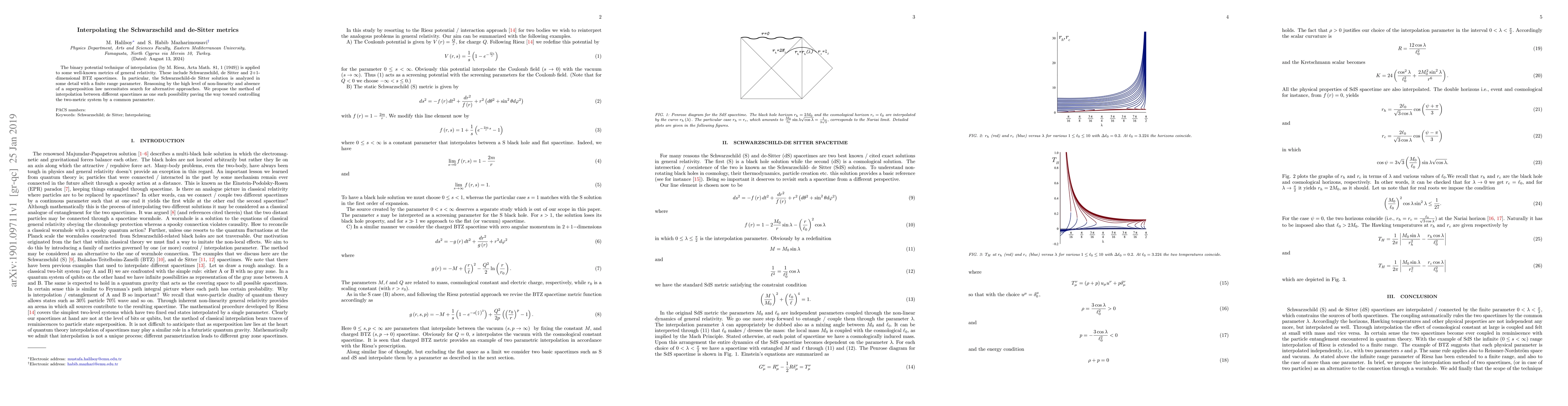 This paper applies M. Riesz's binary potential interpolation technique to interpolate between the Schwarzschild and de Sitter metrics, focusing on the Schwarzschild-de Sitter solution. The method aims to control a two-metric system with a common parameter, addressing the non-linearity and lack of superposition in general relativity.