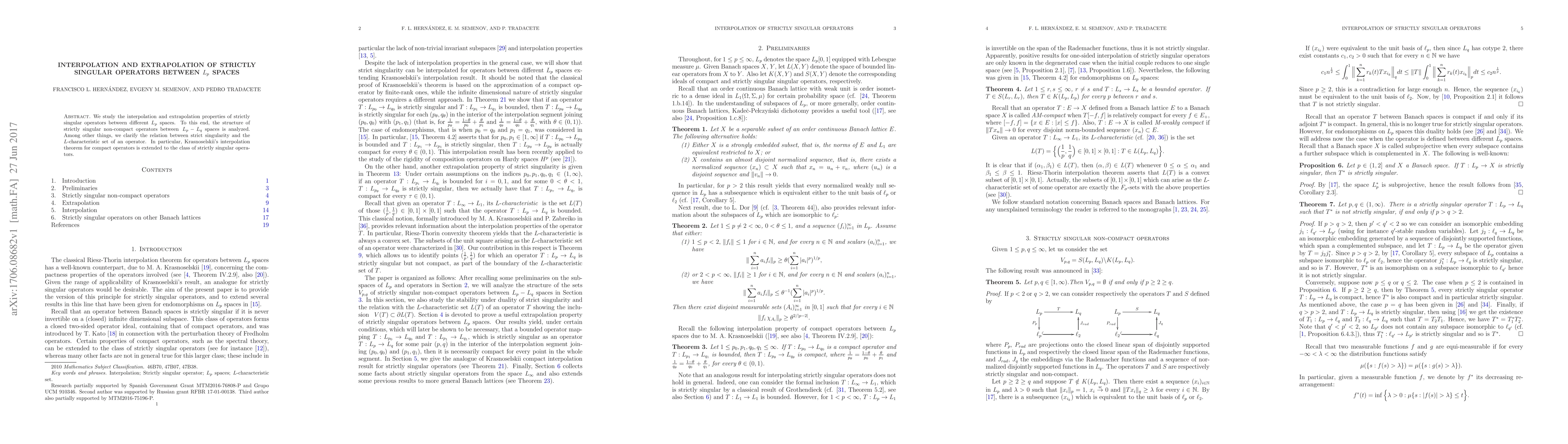 This paper investigates the interpolation and extrapolation properties of strictly singular operators between $L_p$ spaces, analyzing the structure of these non-compact operators and extending Krasnoselskii's interpolation theorem from compact to strictly singular operators, clarifying their relation with the $L$-characteristic set.