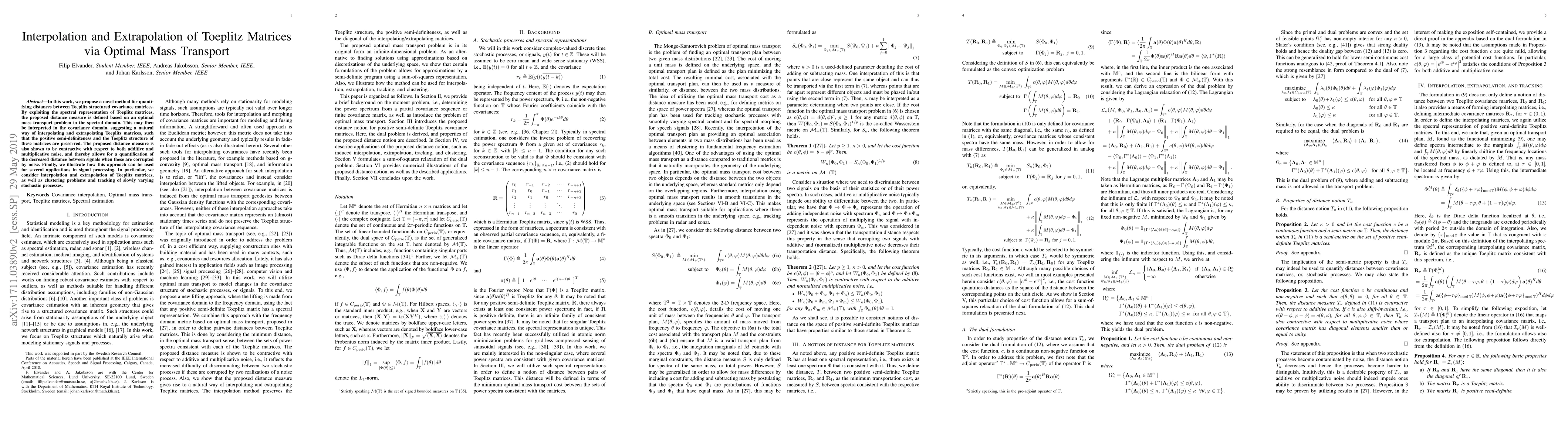This paper introduces a novel method for measuring distances between Toeplitz covariance matrices using optimal mass transport in the spectral domain, enabling interpolation and extrapolation while preserving matrix structure and positive semi-definiteness. The method is shown to be robust to noise and is applied to signal processing tasks like matrix interpolation, clustering, and tracking.