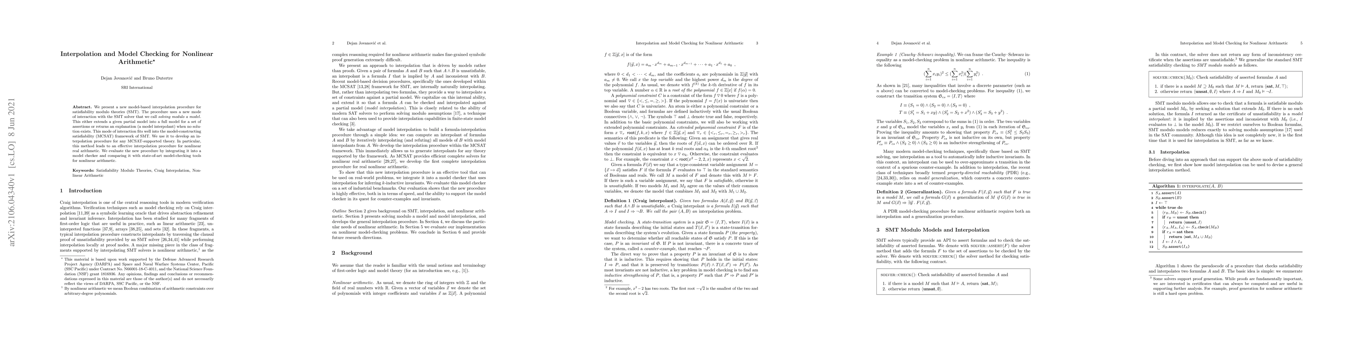 This paper introduces a novel interpolation procedure for satisfiability modulo theories (SMT) that employs a "solving modulo a model" approach, extending partial models or providing interpolants when no solution exists. The method is particularly effective for nonlinear real arithmetic and is evaluated by integrating it into a model checker for comparison with existing tools.