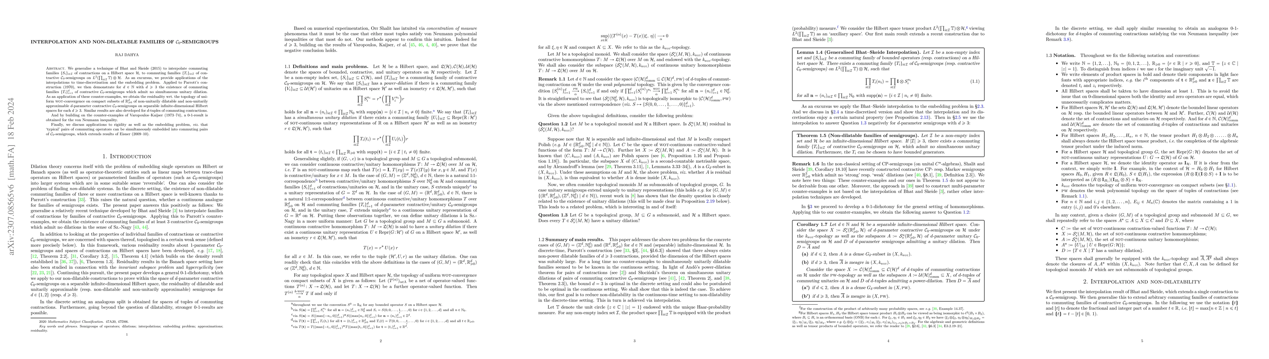 We generalise a technique of Bhat and Skeide (2015) to interpolate commuting families $\{S_{i}\}_{i \in \mathcal{I}}$ of contractions on a Hilbert space $\mathcal{H}$, to commuting families $\{T_{i}\}_{i \in \mathcal{I}}$ of contractive $\mathcal{C}_{0}$-semigroups on $L^{2}(\prod_{i \in \mathcal{I}}\mathbb{T}) \otimes \mathcal{H}$. As an excursus, we provide applications of the interpolations to time-discretisation and the embedding problem. Applied to Parrott's construction (1970), we then demonstrate for $d \in \mathbb{N}$ with $d \geq 3$ the existence of commuting families $\{T_{i}\}_{i=1}^{d}$ of contractive $\mathcal{C}_{0}$-semigroups which admit no simultaneous unitary dilation. As an application of these counter-examples, we obtain the residuality wrt. the topology of uniform wot-convergence on compact subsets of $\mathbb{R}_{\geq 0}^{d}$ of non-unitarily dilatable and non-unitarily approximable $d$-parameter contractive $\mathcal{C}_{0}$-semigroups on separable infinite-dimensional Hilbert spaces for each $d \geq 3$. Similar results are also developed for $d$-tuples of commuting contractions. And by building on the counter-examples of Varopoulos--Kaijser (1973--74), a 0--1-result is obtained for the von Neumann inequality. Finally, we discuss applications to rigidity as well as the embedding problem, \textit{viz.} that `typical' pairs of commuting operators can be simultaneously embedded into commuting pairs of $\mathcal{C}_{0}$-semigroups, which extends results of Eisner (2009--10).