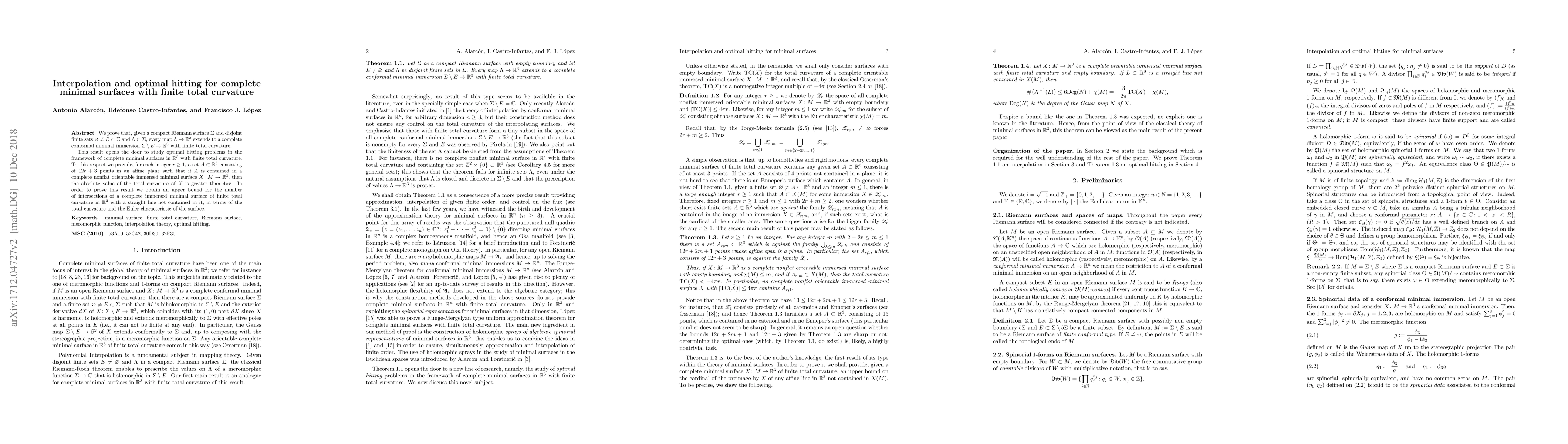 This paper establishes that any map from a set of points on a compact Riemann surface to $\mathbb{R}^3$ can be extended to a complete minimal surface with finite total curvature. It also addresses optimal hitting problems by showing that certain point configurations in $\mathbb{R}^3$ require minimal surfaces with a specific minimum total curvature.