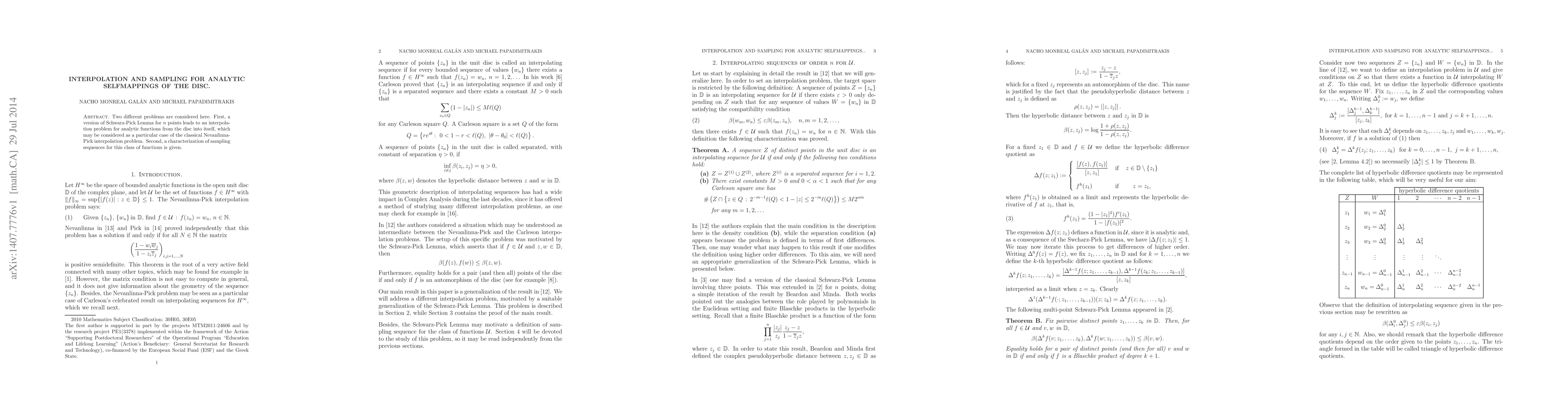 This paper investigates interpolation and sampling for analytic self-mappings of the disc, focusing on a version of the Schwarz-Pick Lemma and its implications for Nevanlinna-Pick interpolation and sampling sequences.