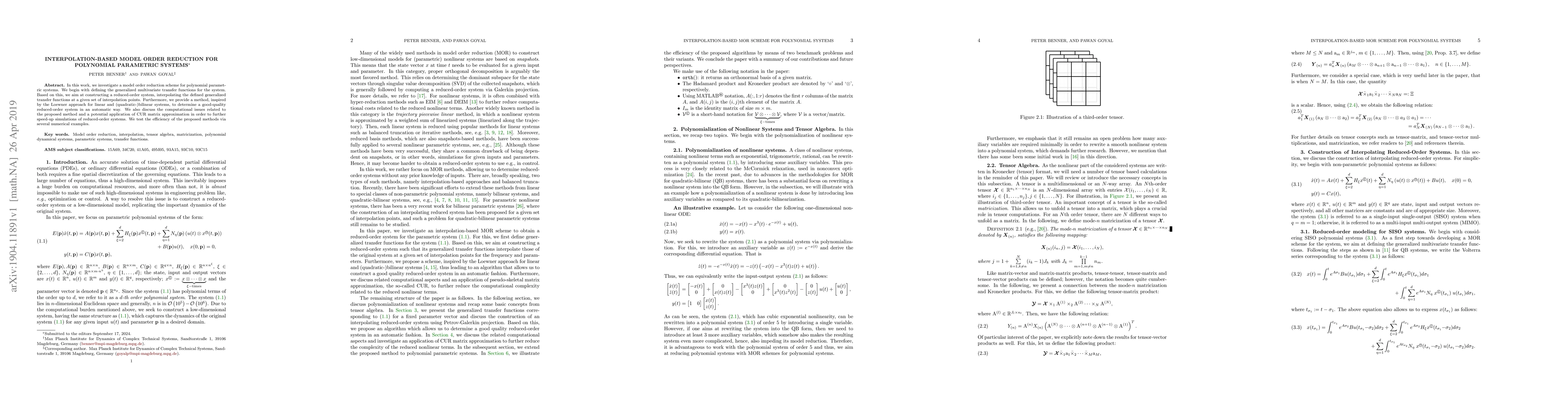 This paper proposes an interpolation-based model order reduction technique for polynomial parametric systems, constructing a reduced-order model that interpolates generalized multivariate transfer functions at specified points. It also introduces an automatic method inspired by the Loewner approach to determine a high-quality reduced-order system and discusses computational efficiency, including potential use of CUR matrix approximation for faster simulations.