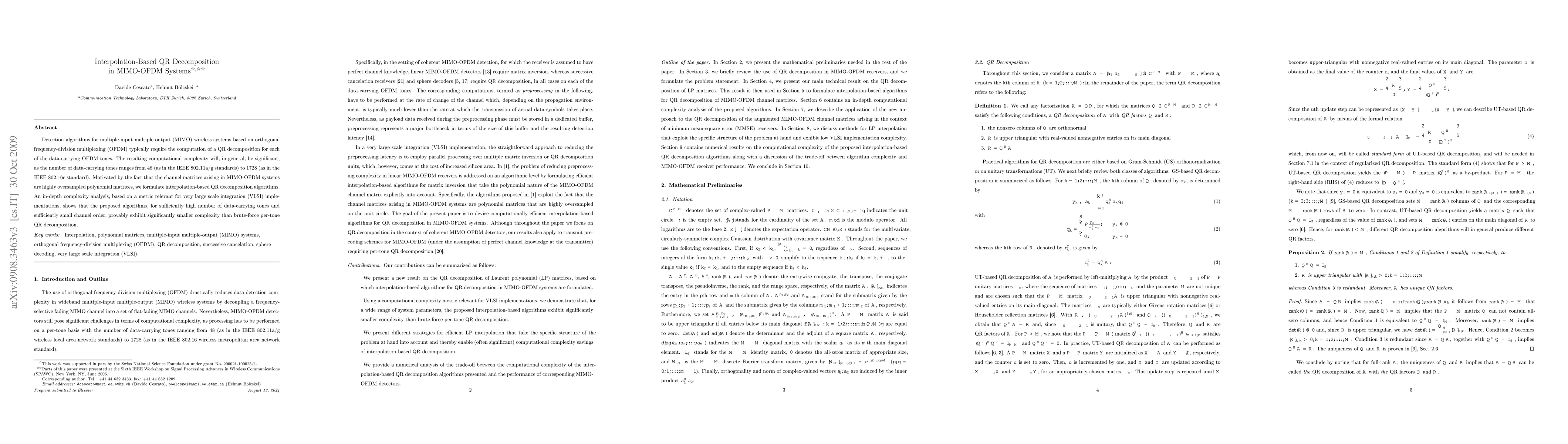 Detection algorithms for multiple-input multiple-output (MIMO) wireless systems based on orthogonal frequency-division multiplexing (OFDM) typically require the computation of a QR decomposition for each of the data-carrying OFDM tones. The resulting computational complexity will, in general, be significant, as the number of data-carrying tones ranges from 48 (as in the IEEE 802.11a/g standards) to 1728 (as in the IEEE 802.16e standard). Motivated by the fact that the channel matrices arising in MIMO-OFDM systems are highly oversampled polynomial matrices, we formulate interpolation-based QR decomposition algorithms. An in-depth complexity analysis, based on a metric relevant for very large scale integration (VLSI) implementations, shows that the proposed algorithms, for sufficiently high number of data-carrying tones and sufficiently small channel order, provably exhibit significantly smaller complexity than brute-force per-tone QR decomposition.