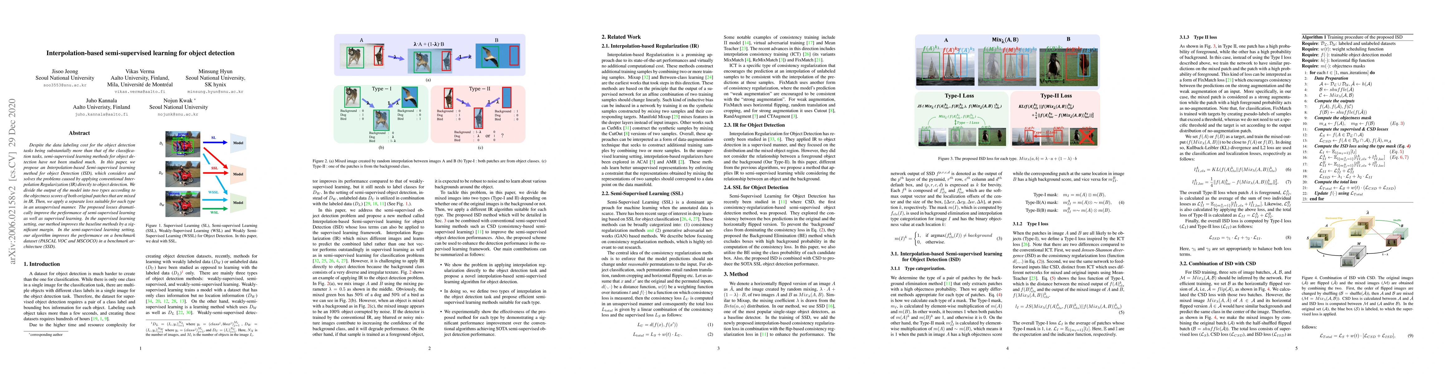 This paper introduces an Interpolation-based Semi-supervised learning method for object detection (ISD) to address the challenges of data labeling costs. The proposed method divides model outputs into two types based on objectness scores and applies separate unsupervised losses, significantly enhancing both semi-supervised and supervised learning performance on benchmark datasets.