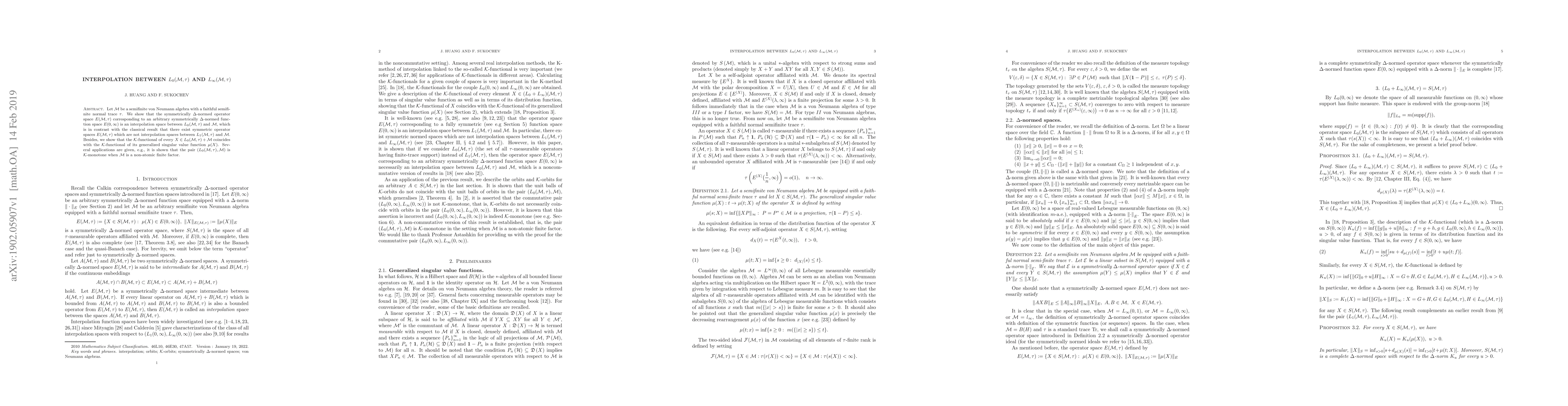 Let ${\mathcal M}$ be a semifinite von Neumann algebra with a faithful semifinite normal trace $\tau$. We show that the symmetrically $\Delta$-normed operator space $E({\mathcal M},\tau)$ corresponding to an arbitrary symmetrically $\Delta$-normed function space $E(0,\infty)$ is an interpolation space between $L_0({\mathcal M},\tau)$ and ${\mathcal M}$, which is in contrast with the classical result that there exist symmetric operator spaces $E({\mathcal M},\tau)$ which are not interpolation spaces between $L_1({\mathcal M},\tau)$ and ${\mathcal M}$. Besides, we show that the ${\mathcal K}$-functional of every $X\in L_0({\mathcal M},\tau)+ {\mathcal M} $ coincides with the ${\mathcal K}$-functional of its generalized singular value function $\mu(X)$. Several applications are given, e.g., it is shown that the pair $(L_0({\mathcal M},\tau),{\mathcal M})$ is ${\mathcal K}$-monotone when ${\mathcal M}$ is a non-atomic finite factor.